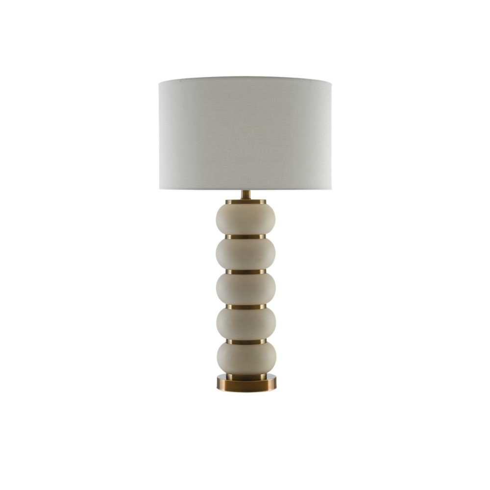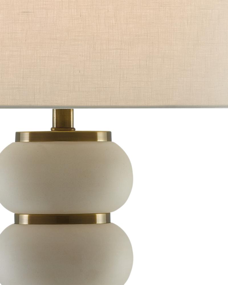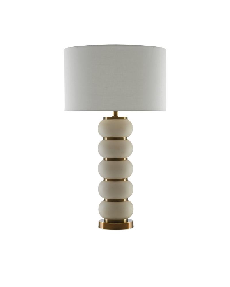 Our Luko Table Lamp is made of stacked quashed balls of ceramic in a white-mud finish interspersed with metal rings in an antique brass finish. These match the metal base and the hardware. Our Vica Table Lamp is the same design in a black-mud finish.