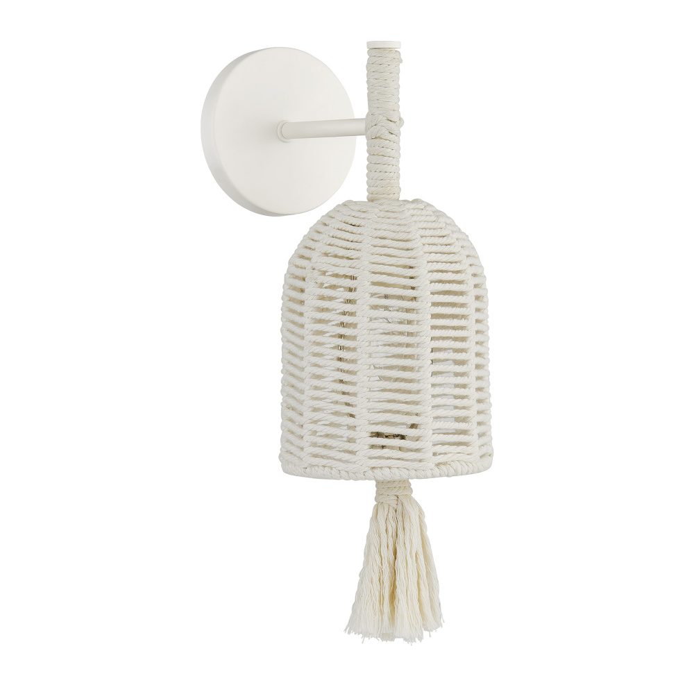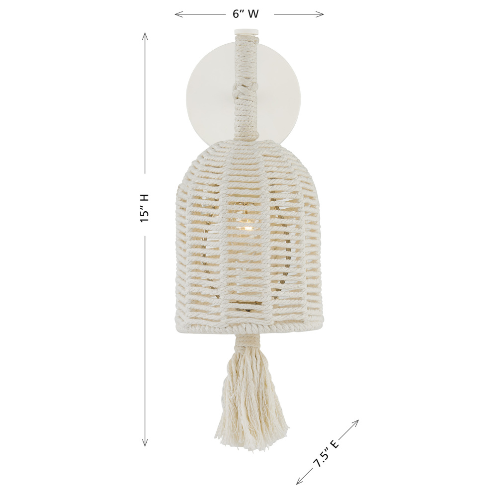The Savoy House Lunara 1-light sconce was designed by award-winning interior designer and TV host Breegan Jane. With its woven shade and tassel crafted from cotton rope, it brings a serene and easygoing presence. The Painted White Alabaster finish is a flawless match for the cotton rope. Lunara is 15" in height, 6" in width and extends 7.5" from the wall. It uses one candelabra size bulb of up to 60 watts. Bulb not included. This sconce is damp area rated.