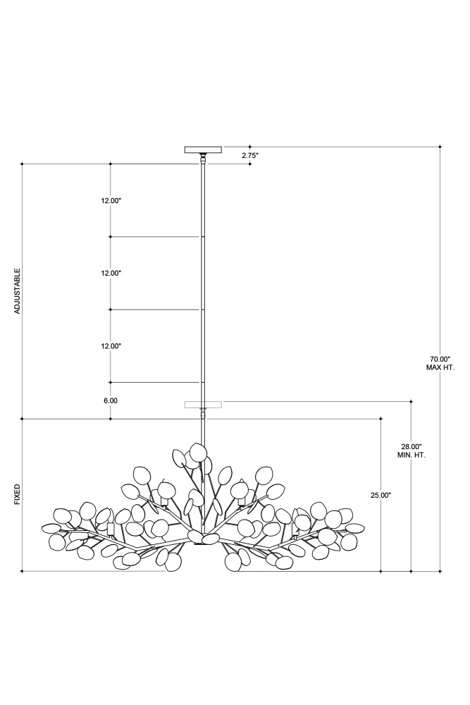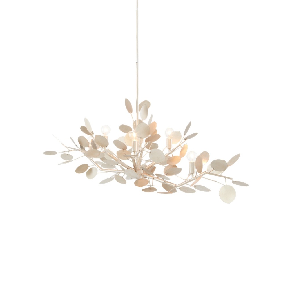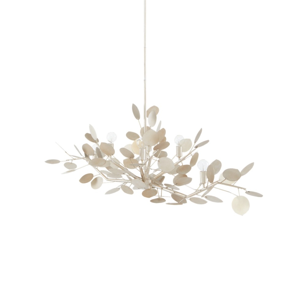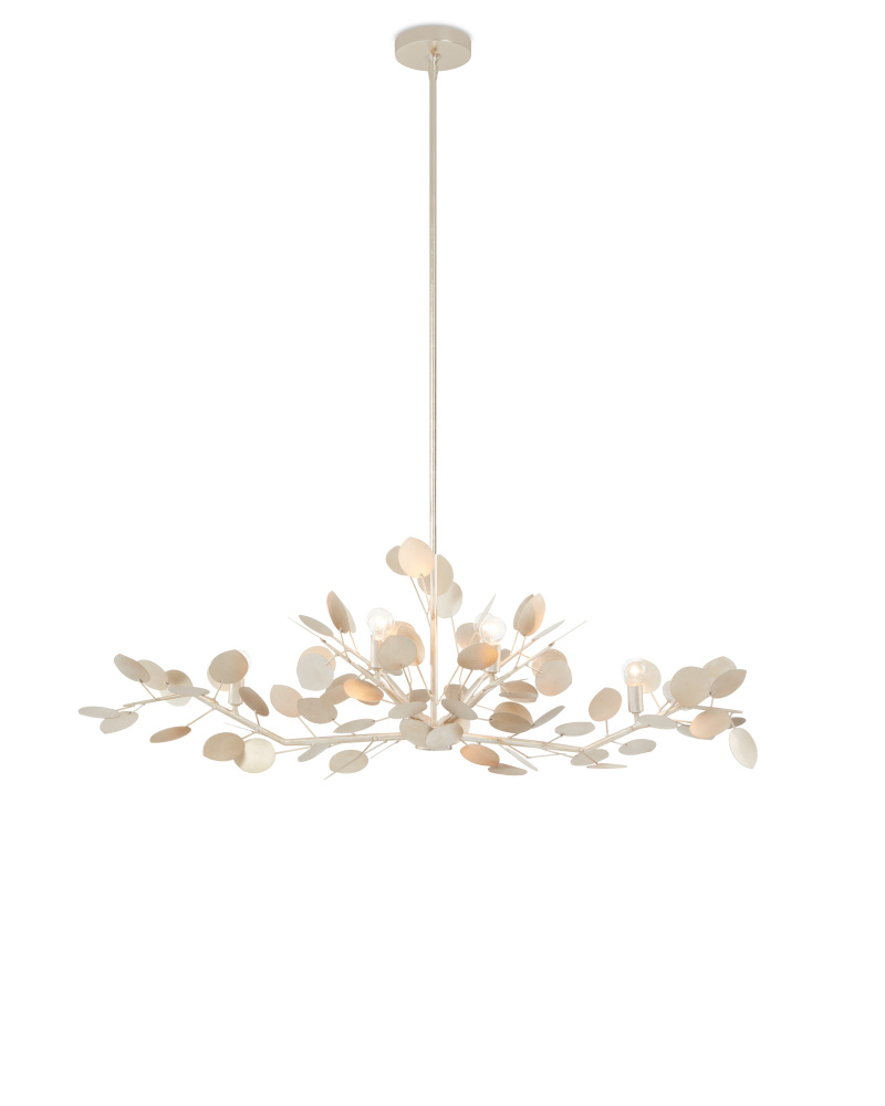 With a lyrical profile of fluttering discs that favor the leaves of its namesake plant, the Lunaria Oval Chandelier is made of wrought iron in a contemporary silver leaf finish. The bulbs that are sprinkled amongst the flowing petals of metal reflect off the finish on this silver chandelier to increase the glow. Adjustable from 28" to 70" with use of included chain/rod kit/cable. If your space calls for a longer drop, additional chain/rods/cable is available for purchase.