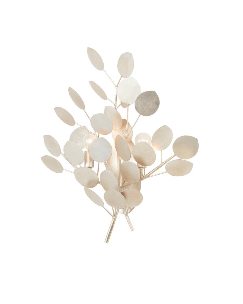 With a lyrical profile of fluttering discs that favor the leaves of its namesake plant, the Lunaria Wall Sconce is made of wrought iron in a contemporary silver leaf finish. The bulbs that are sprinkled amongst the flowing petals of metal reflect off the finish on this silver wall sconce to increase the glow.