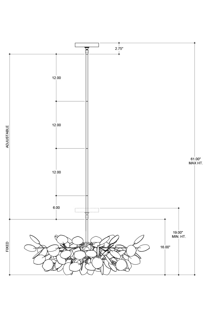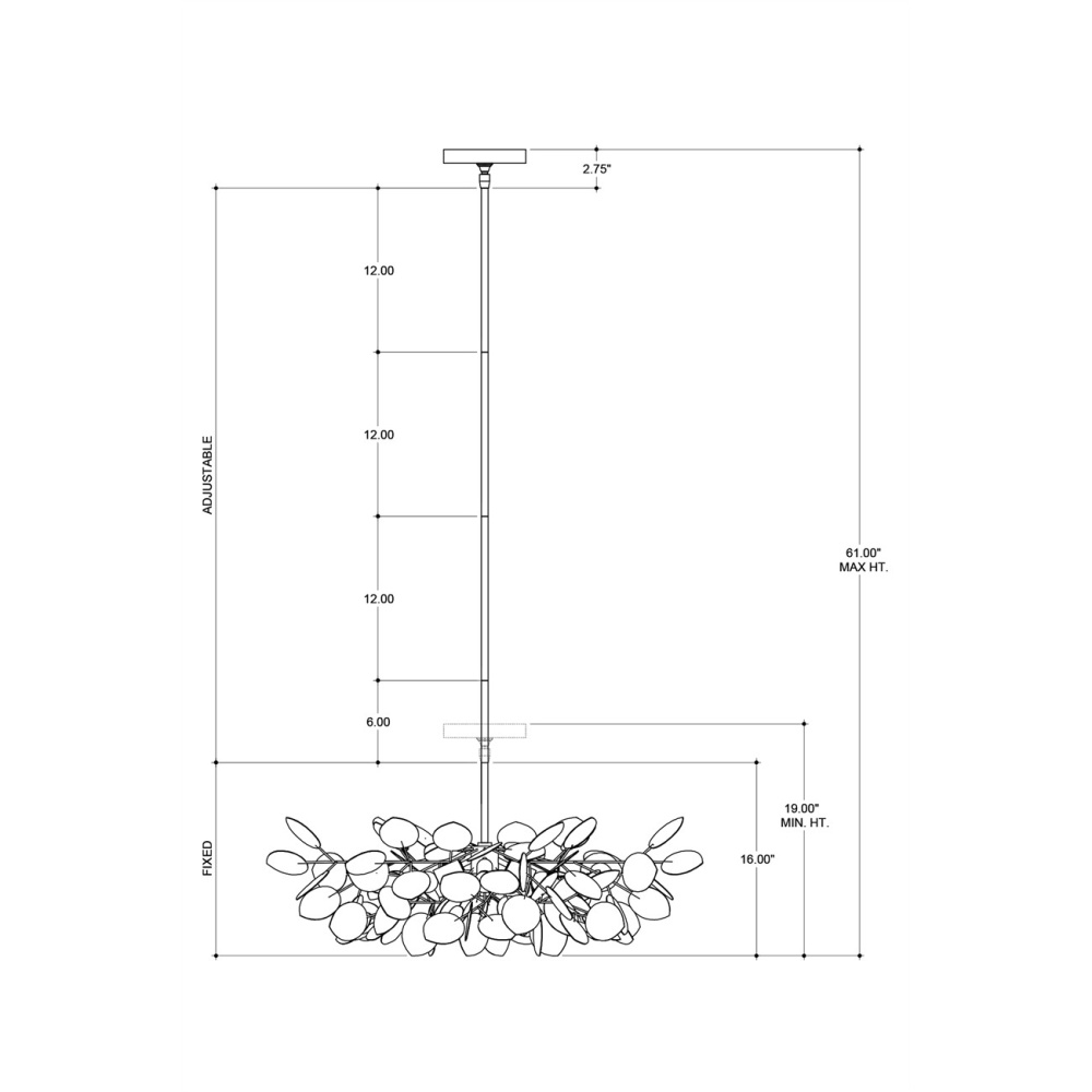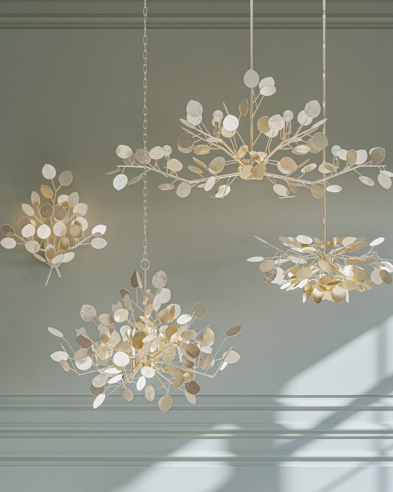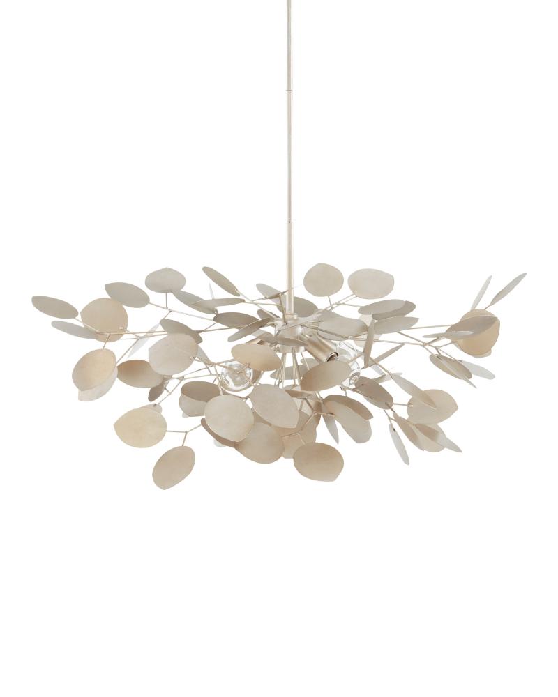 With a lyrical profile of fluttering discs that favor the leaves of its namesake plant, the Lunaria Small Chandelier is made of wrought iron in a contemporary silver leaf finish. The bulbs that are sprinkled amongst the flowing petals of metal reflect off the finish on this silver chandelier to increase the glow. Adjustable from 19" to 61" with use of included chain/rod kit/cable. If your space calls for a longer drop, additional chain/rods/cable is available for purchase.