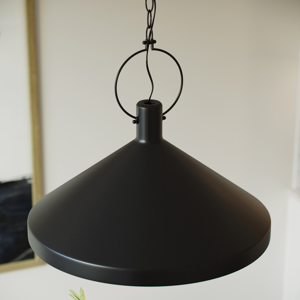 Gordon features a tapered steel shade suspended from a chain and set into a round canopy and is suitable for damp locations