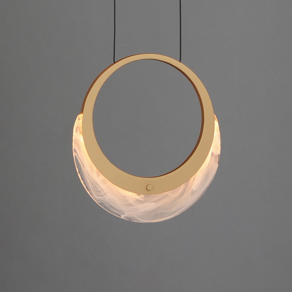 Named for the Greek constellation associated with music and harmony, Lyra strikes a poetic balance between sculpture and light. Crescent-shaped cast glass, swirled in clear and white, is cradled in golden rings and suspended by slender black cables to evok