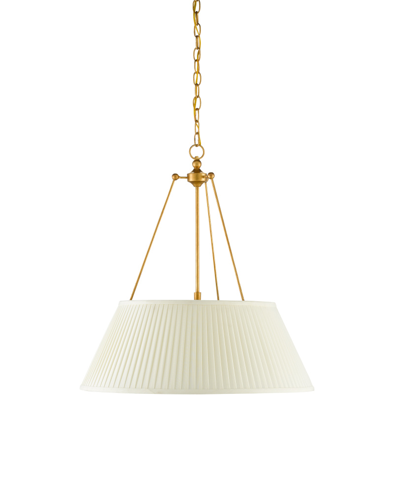 Though the Lytham Pendant has nostalgic references to hanging fixtures from the age of Americana, the length of the frame that extends down to hold the shade brings a fresh, modern feel to this gold pendant. Made of wrought iron in an antique gold leaf finish, the pendant light with pleated shade gleams bright. Adjustable from 32.5" to 100.5" with use of included chain/rod kit/cable. If your space calls for a longer drop, additional chain/rods/cable is available for purchase.