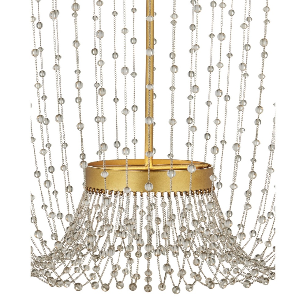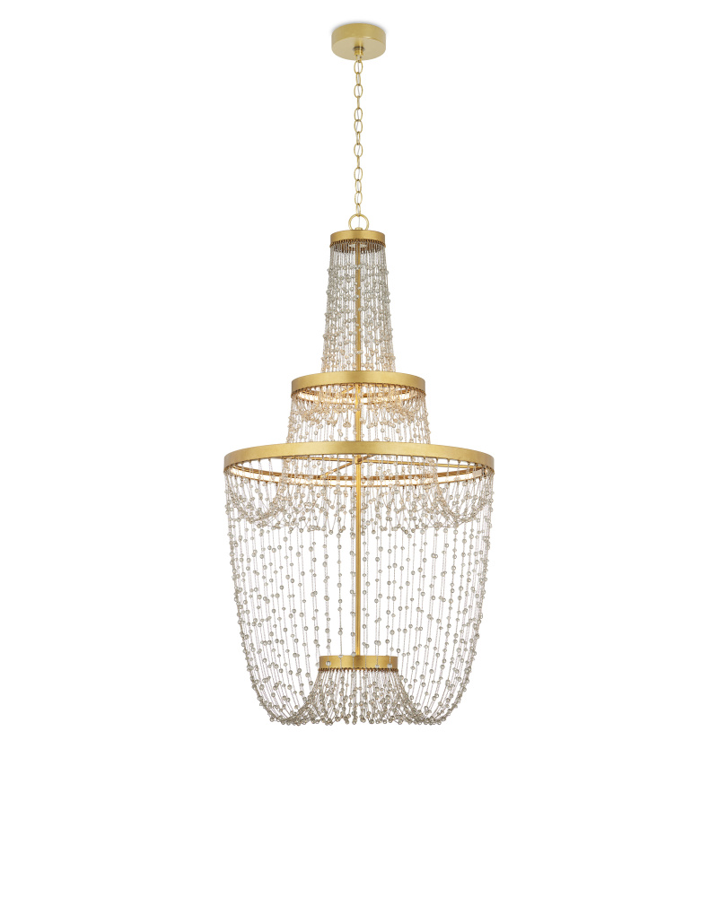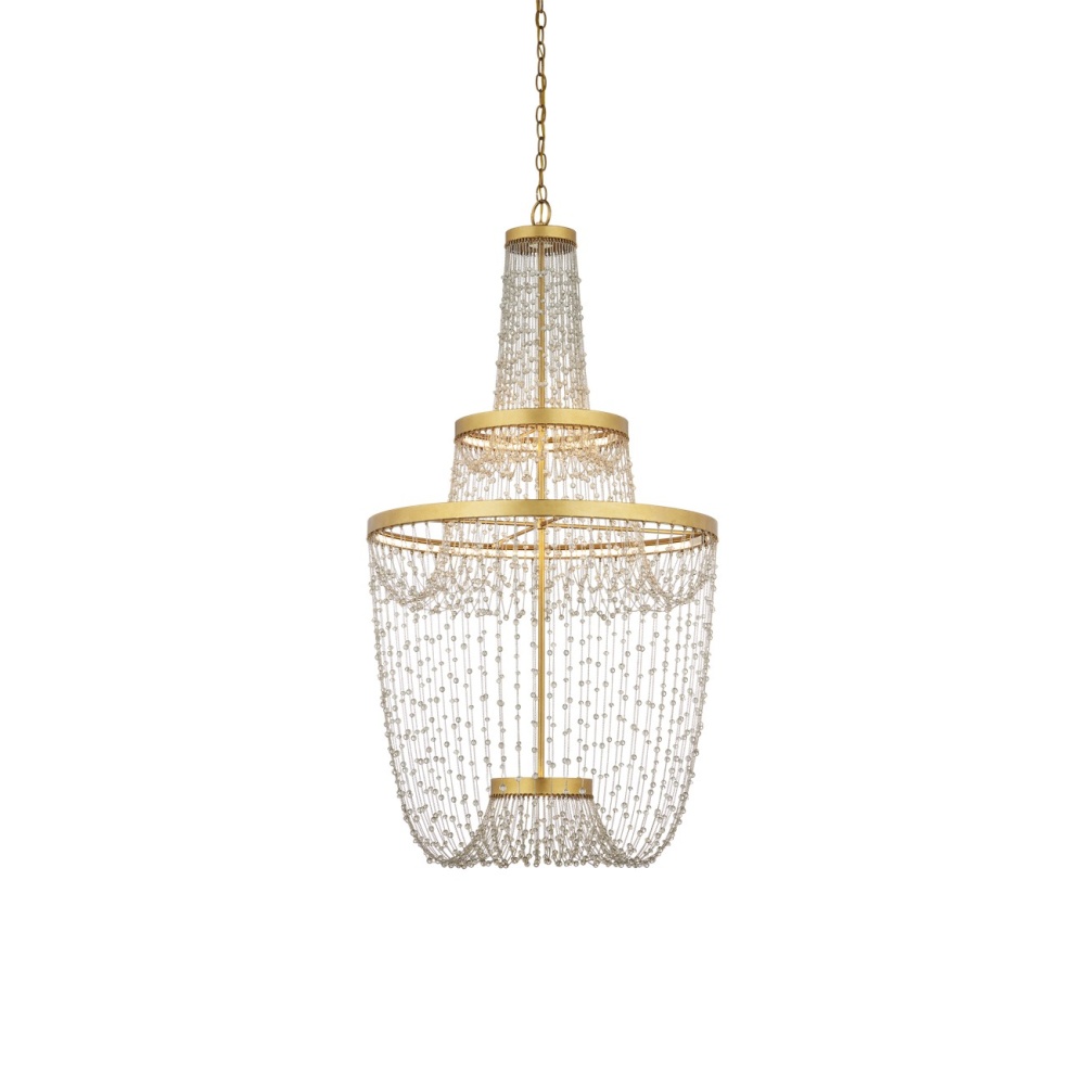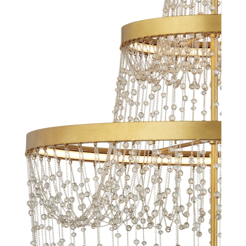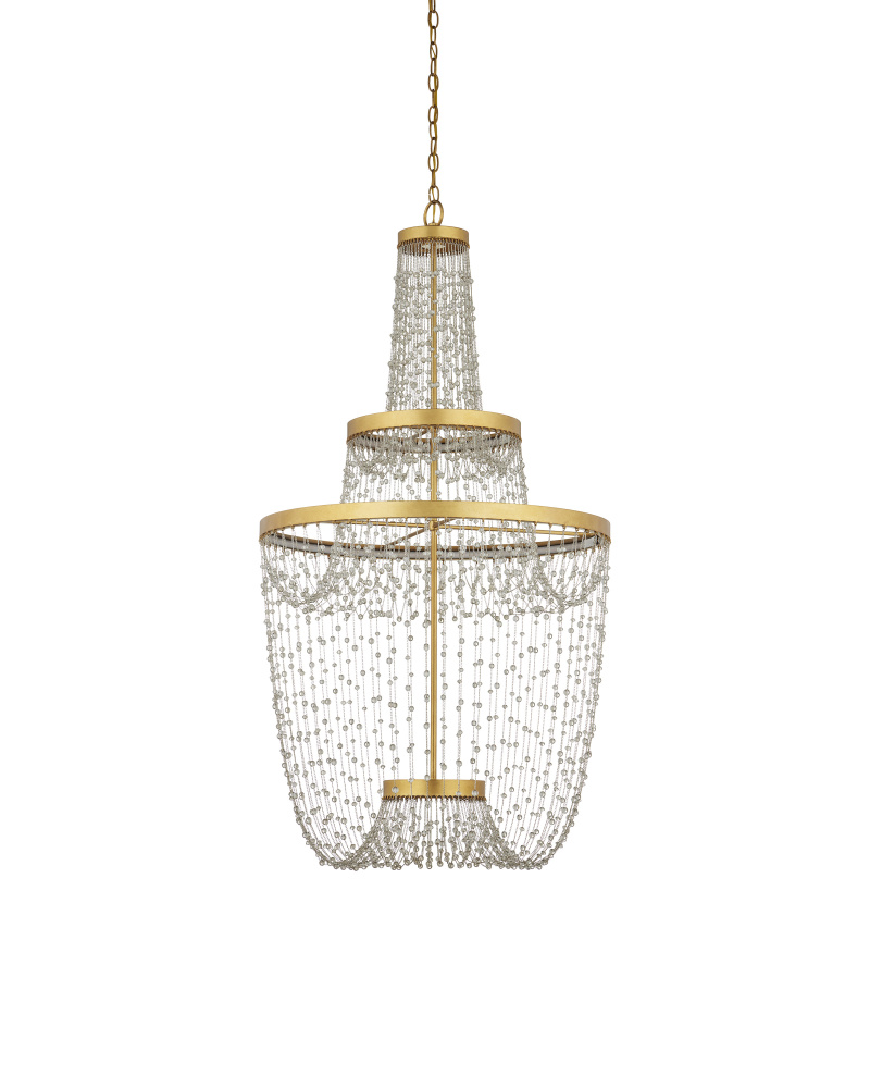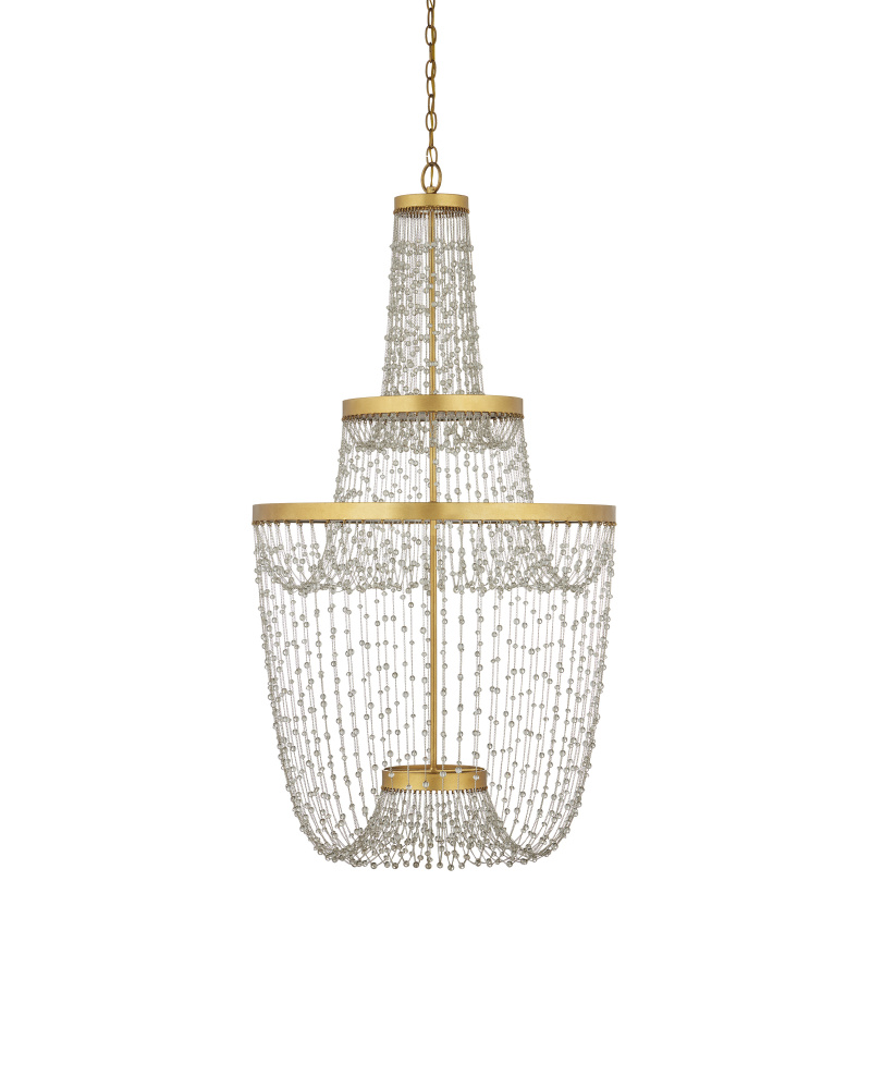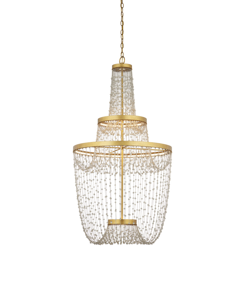The glamorous Mademoiselle Chandelier is luminous for a number of reasons: the glass beads that swag from brilliant contemporary gold leaf rings, the brightness of the gold, and the integrated LED strips that sit within the rings to create such a uniform glow. The way the two sizes of beads are strung creates a wonderful sense of movement. Adjustable from 61.5" to 129.5" with use of included chain/rod kit/cable. If your space calls for a longer drop, additional chain/rods/cable is available for purchase.