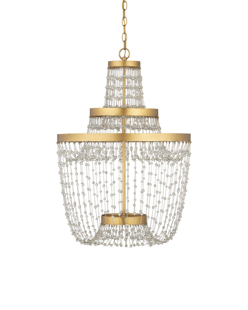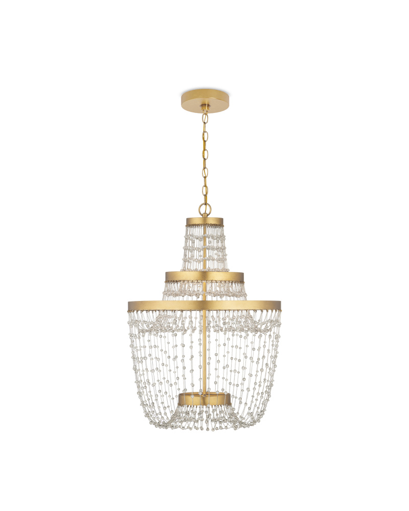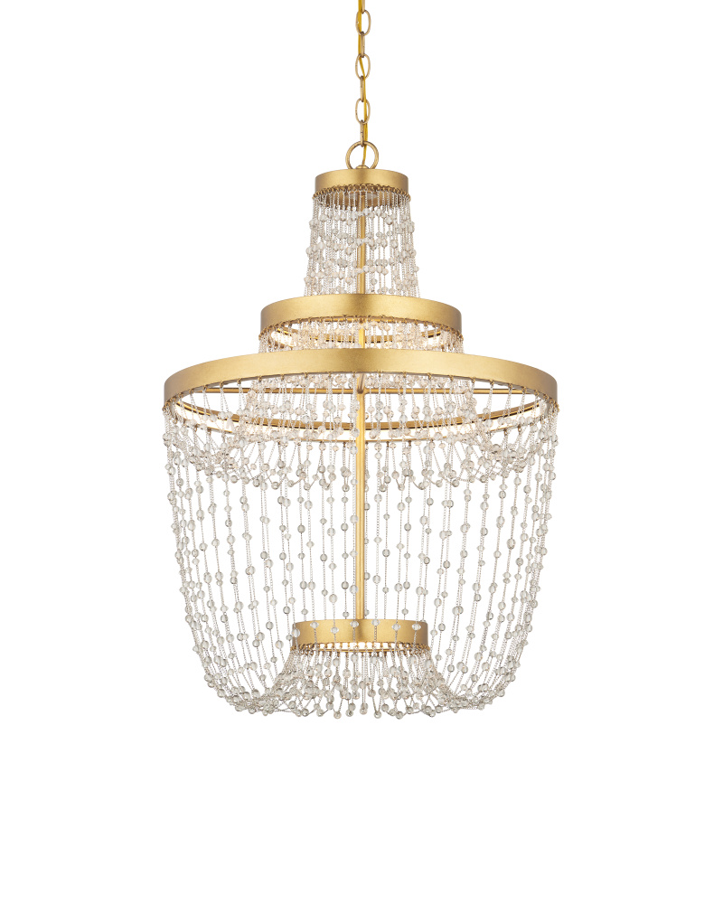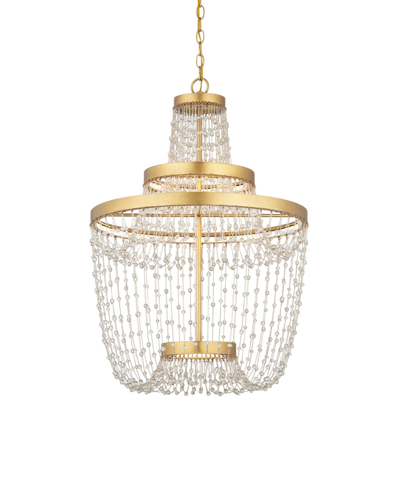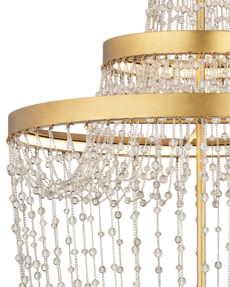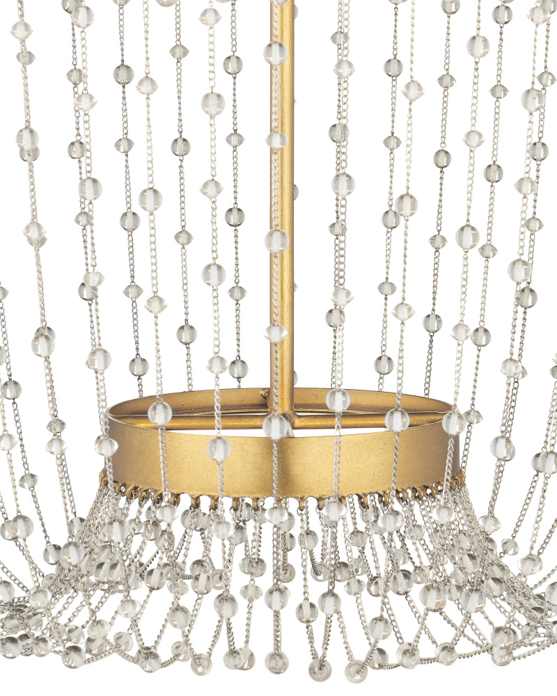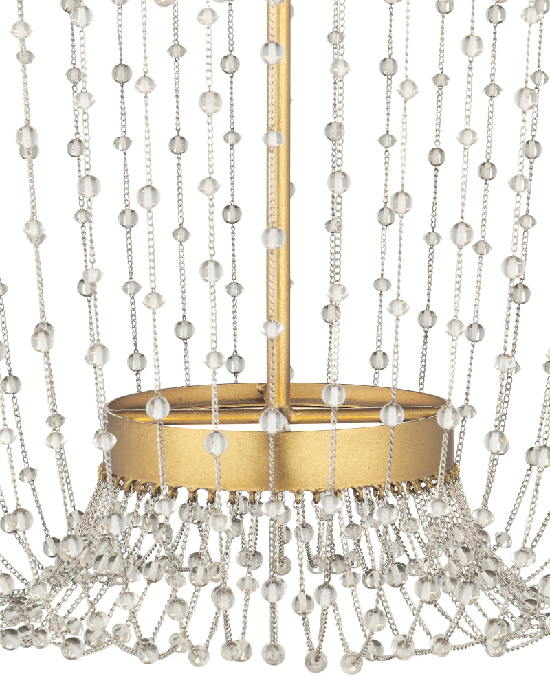 The Mademoiselle Medium Chandelier is luminous with swags of glass beads that flow from wrought iron bands in a contemporary gold leaf finish. The brightness of the gold and glimmer of the beads are illuminated by integrated LED strips that sit behind the rings to create a uniform glow. The open and airy form is created with two sizes of beads that are strung in a free-flowing way that calls to mind Hollywood glamour. Adjustable from 41" to 109" with use of included chain/rod kit/cable. If your space calls for a longer drop, additional chain/rods/cable is available for purchase.