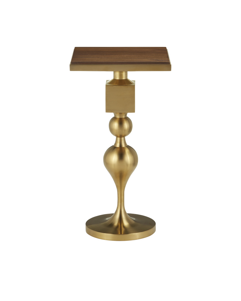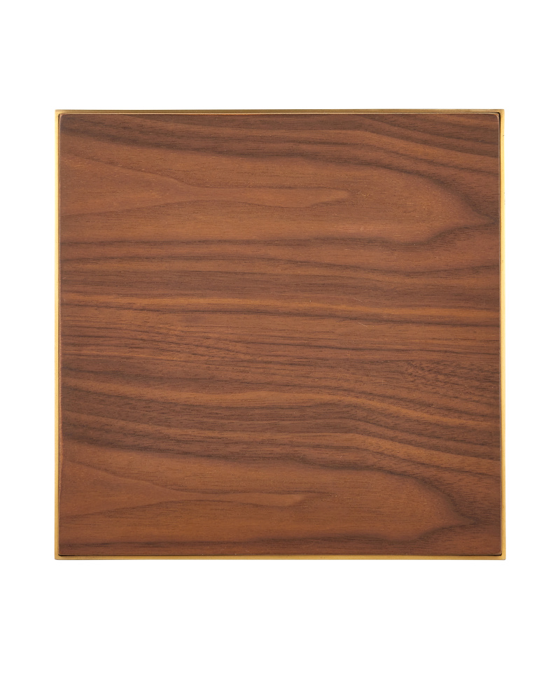 Geometric and gorgeous, the Maeve Accent Table is made of stainless steel in a brushed brass finish with an inset walnut top. The gold accent table gets its punch from its series of stacked shapes that rise toward its top, while the square piece of wood brings an uptick in warmth.