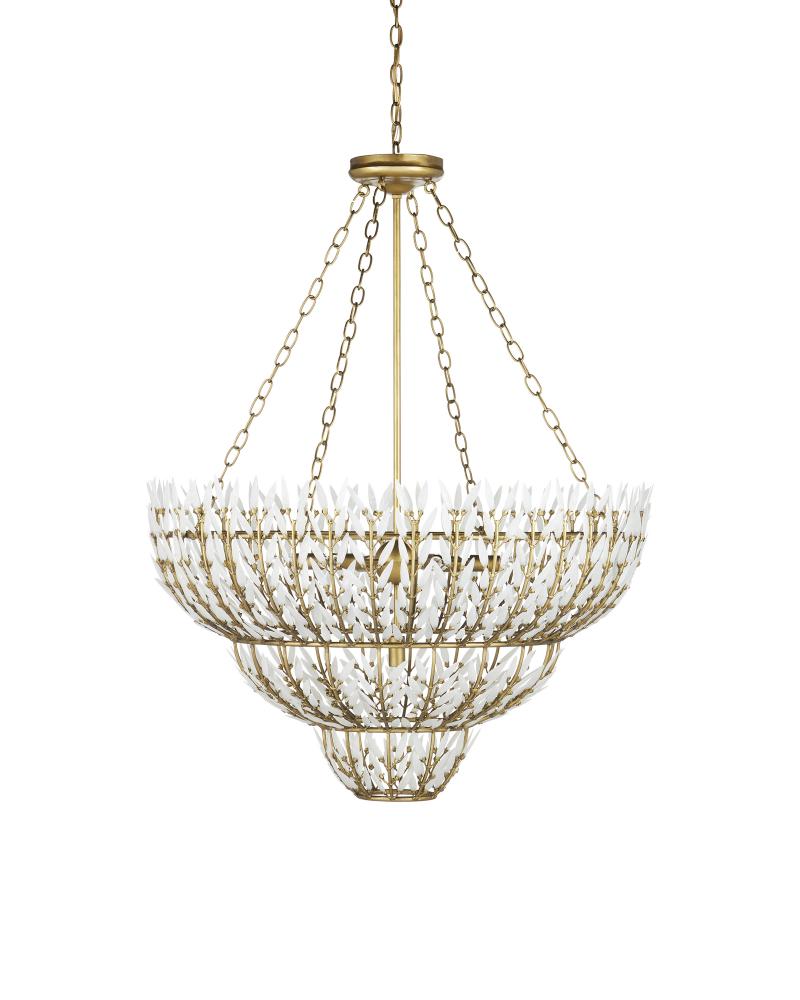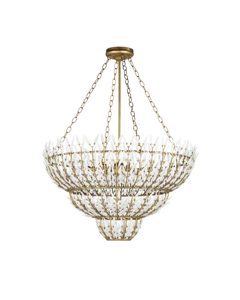 The Magnum Opus Large Chandelier is a clean-lined version of a vintage design, meticulously conceived to bring elegance to any space. The rows of glass leaves attached to the three-tier metal stems effervesce when light strikes them to create a stunning sculptural fixture. The white glass also beautifully contrasts the metal in a brass finish, the cool/warm contrast bringing the gold chandelier a heightened level of texture. The beautiful white glass leaves also surround the seven bulbs on this fixture to infuse a space with a lovely glow. Adjustable from 48.5" to 116.5" with use of included chain/rod kit/cable. If your space calls for a longer drop, additional chain/rods/cable is available for purchase.