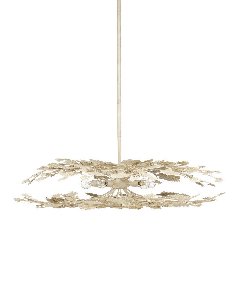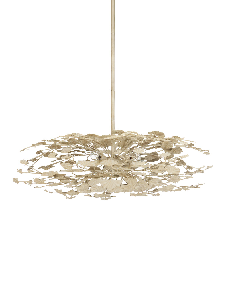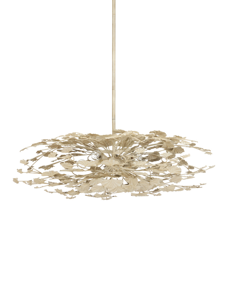 Inspired by the Ginkgo leaf, the Maidenhair Cream Semi-Flush Mount captivates with its flowing pattern of fan-shaped leaves. This is a lovely design when viewed from the bottom, as it becomes clear how much depth the beige semi-flush ceiling light has. The antique pearl finish on the shade glows when the lights are switched on and the telescoping leaves create patterns on surrounding surfaces. This nature-inspired chandelier is perfect for a biophilic project. Adjustable from 16.5" to 58.5" with use of included chain/rod kit/cable. If your space calls for a longer drop, additional chain/rods/cable is available for purchase.