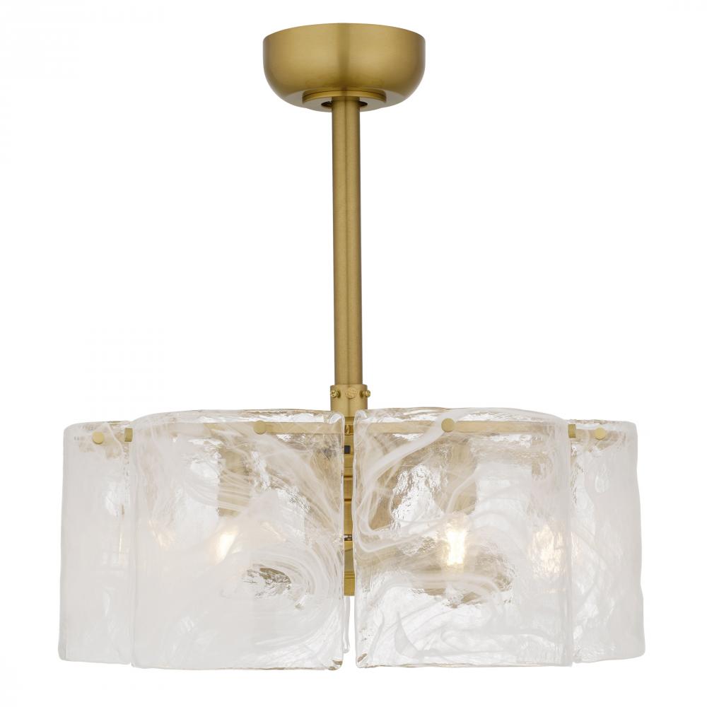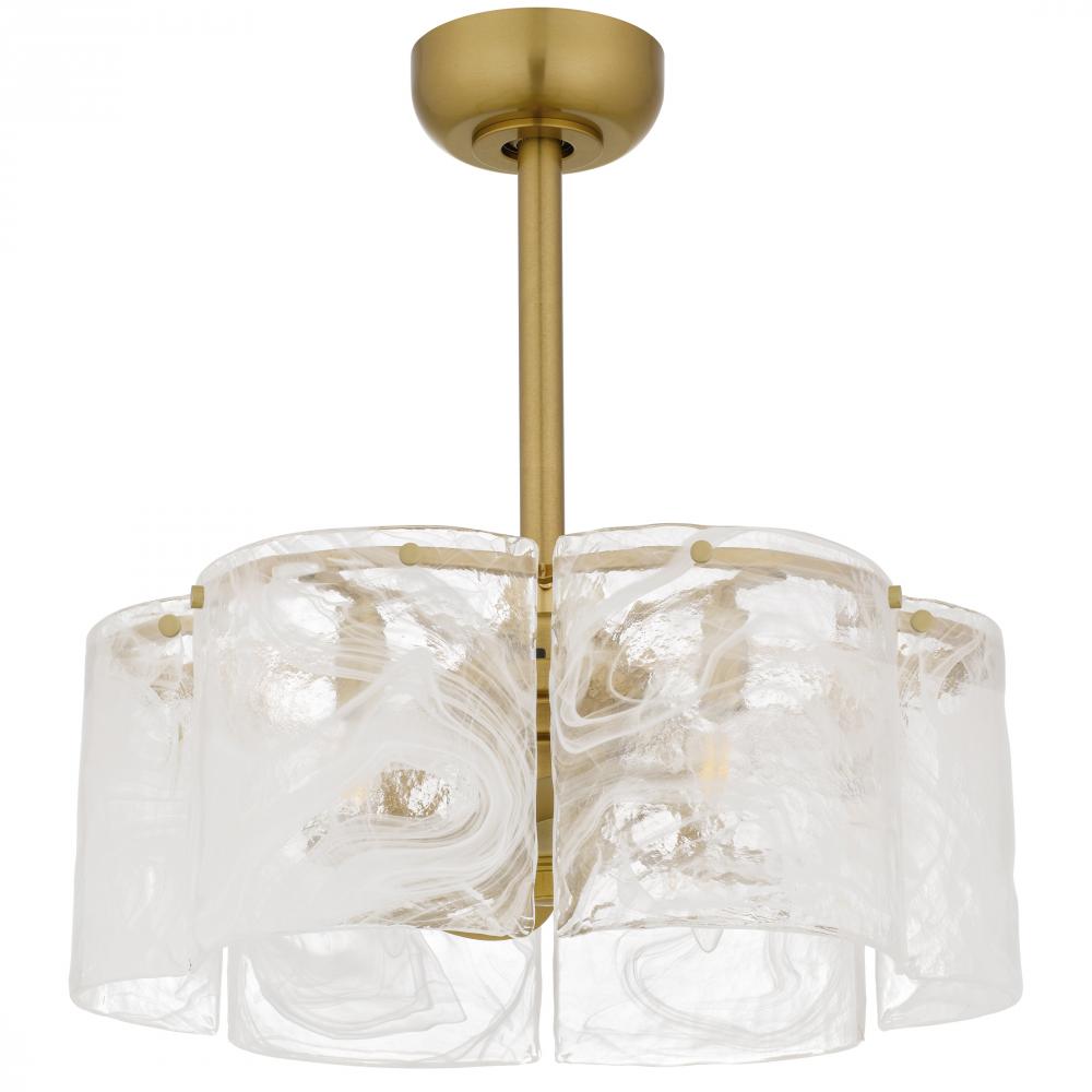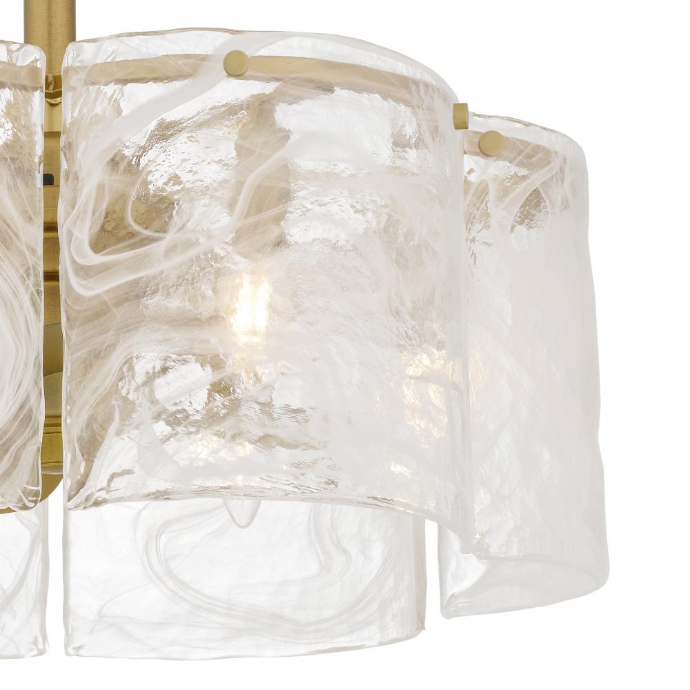 Maisie captures the soft poetry of air and light in motion. Gently curved panels of white swirl glass surround the fixture like flowing silk, their delicate patterns evoking wisps of clouds on a golden afternoon. Each glass piece is uniquely marbled, creat