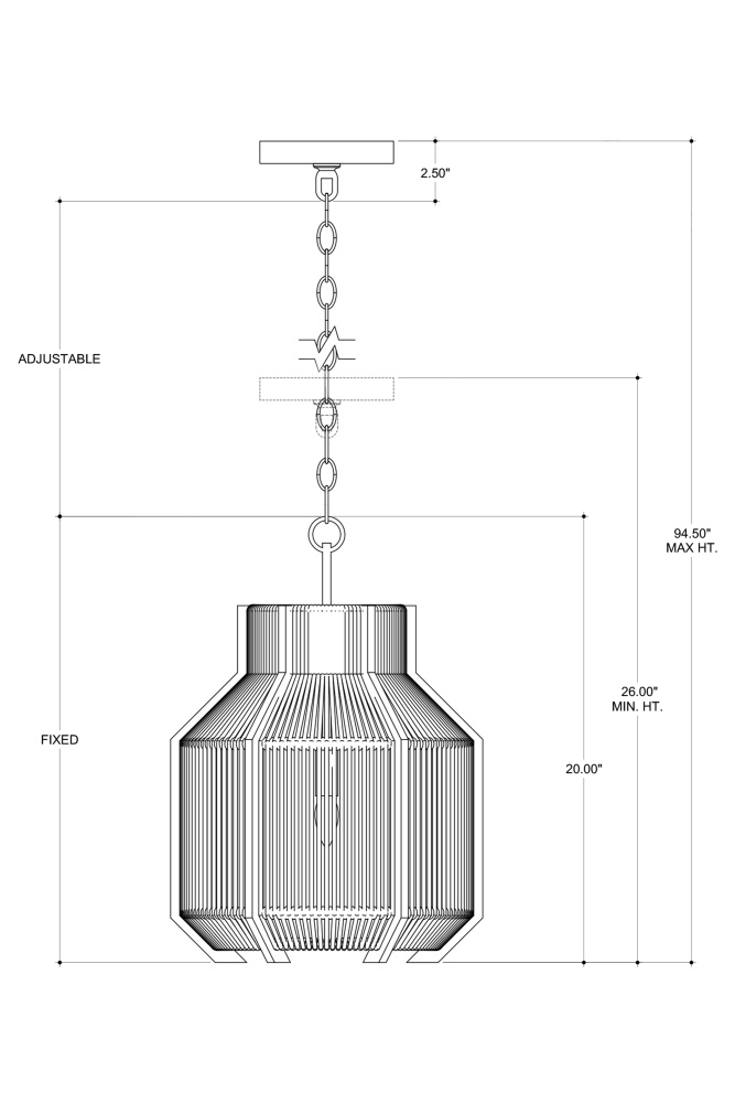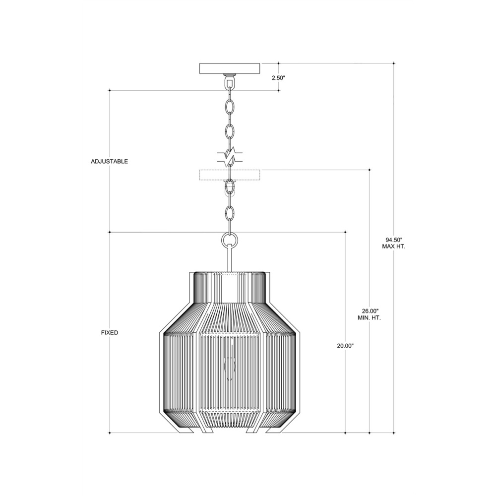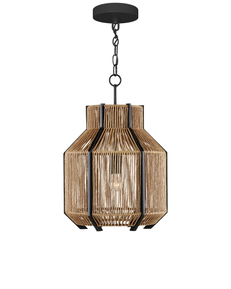 The Mali Pendant has a complex interplay of sleek and earthy elements. The lines that rise above and below the natural woven shade of the rope pendant are made of wrought iron in a satin black finish, as are the chain from which it is hung and the hardware that holds the bulb. These are the clean-lined elements that contrast the Kraft paper twine, which is tightly woven but not so dense that it interrupts the warm glow of illumination from its interior. Adjustable from 25" to 93" with use of included chain/rod kit/cable. If your space calls for a longer drop, additional chain/rods/cable is available for purchase.