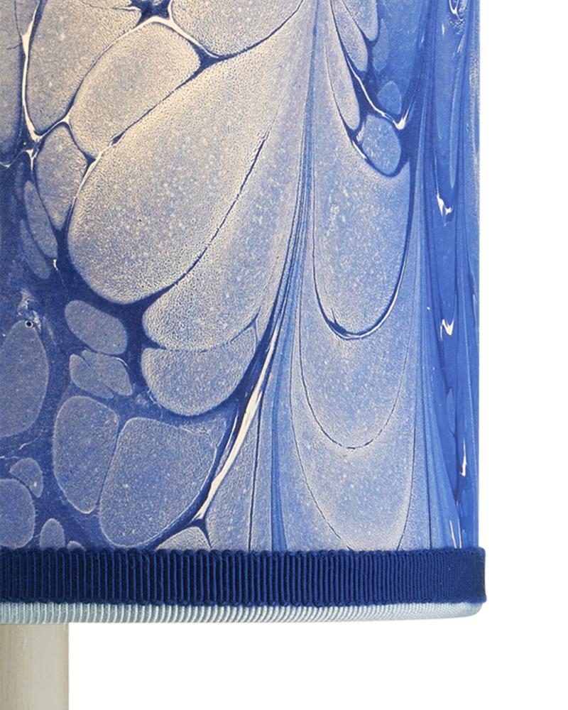 Petite shades are an easy way to bring added style to a space while also introducing color and texture, particularly when they are made from artisanal marbleized paper and ornamented with two layers of grosgrain ribbon in different hues. The saturation of the colors on the handmade tapered and cylindrical shades for chandeliers and wall sconces is achieved by a New England atelier. Patterns will vary because they are created during a very organic process that makes any surface treated to marbleizing so special. There are both vivid and pastel patterns in this collection, as you can see from this swirling bright blue version of the drum shade. Top Diameter: 5" Bottom Diameter: 5" Height: 5"