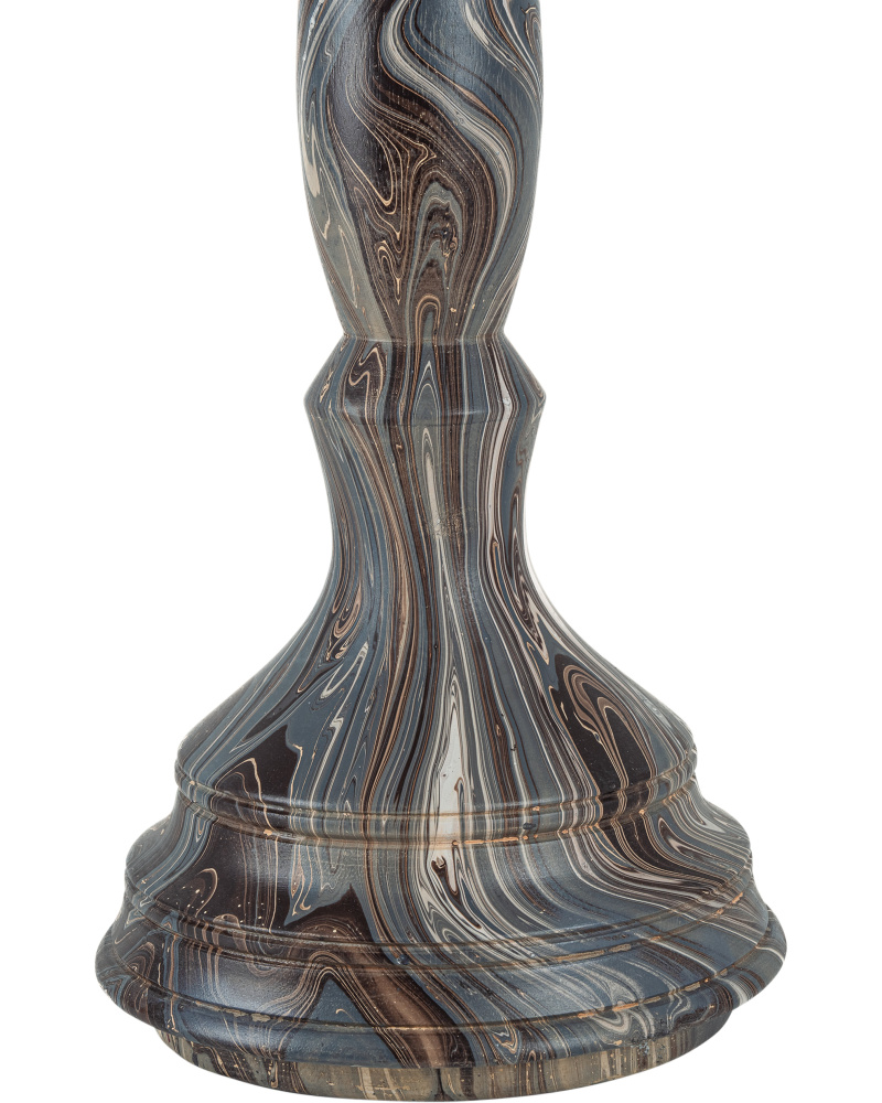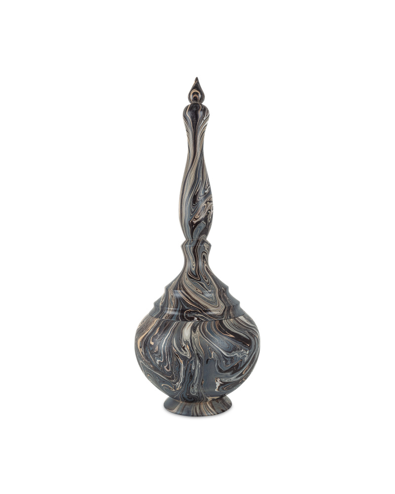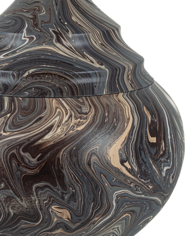 The Marbleized Short Turret Box is a commandingly large hand-carved wood sculptural container with a classic antique-inspired form. The surface of the elegant decorative accessory has been treated to a brown marbleized technique that was developed for paper during the 15th century. The sense of movement this brings to the piece makes its rounded form feel kinetic. There will be variations on the exterior of this accessory given it is painted by hand, a beautiful quality of this technique.