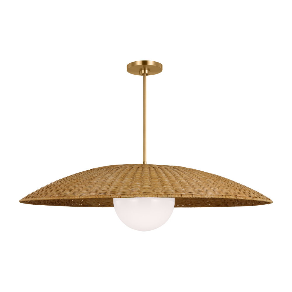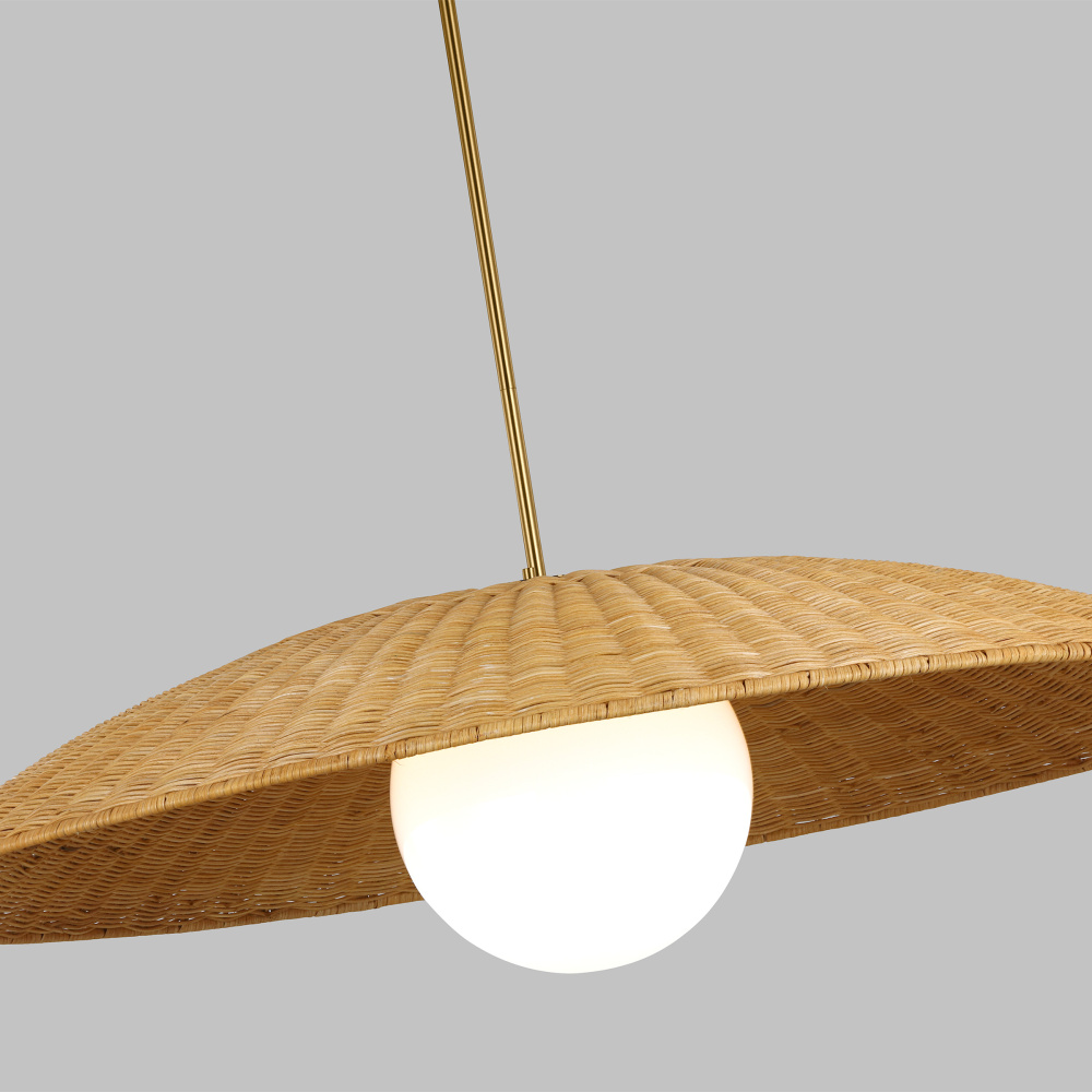 Mari is inspired by rattan handbags from kate spade new york as well as classic 50s and 60s modernist profiles. Hand-woven rattan gives this series an organic, tropical vibe and ensures a warm glow. The golden canopy adds a dash of glamour. Filtering the light from within, each piece creates a play of light and shadow in a room, adding an inviting ambiance. Mari can work with various boho decor and in homes with coastal or farmhouse styling.