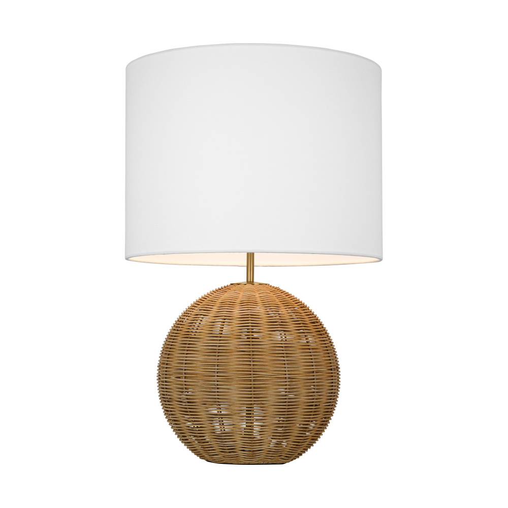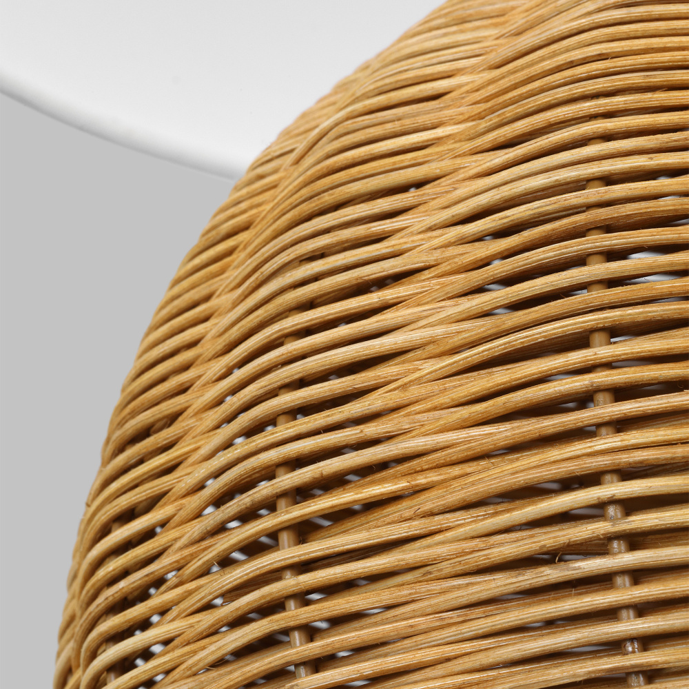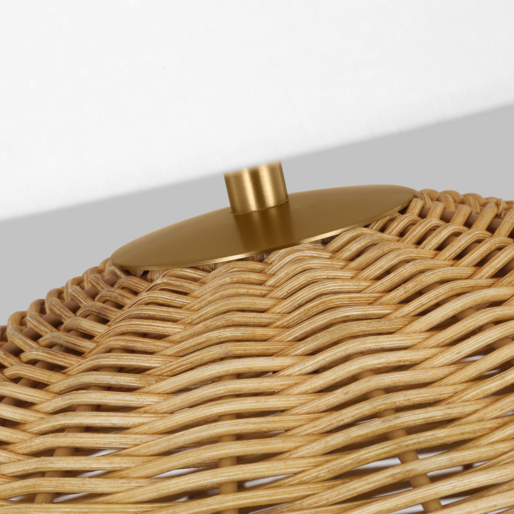Features a hand-woven rattan base and fabrice white linen shade