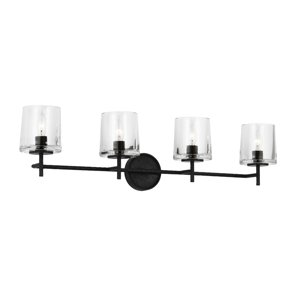 The Marietta four light vanity fixture in Aged Iron embodies Industrial charm with Midcentury flair, the Marietta vanity series features curved arms and mouth blown glass. This streamlined vanity series is crafted in an Aged Iron hammered iron finish that is simple yet timeless. Sophisticated and modern with an industrial edge, this sconce boasts a classic look that works well in any decor.