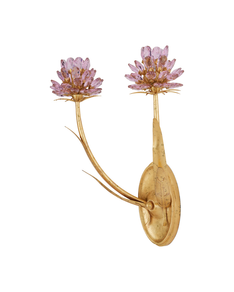 Everything about the Marilee Double-Light Wall Sconce is luminous, from its Dutch Gold Leaf finish to the crystal blossoms that rise from the ends of its stems. The bulbs are nestled into the faceted pink crystals to bring effervescence to the glass. The detailing on the arms looks like leaves flowing up from the wallplate and a palm detail spritzes beneath the blossoms like implied bobeches. The gold wall sconce, which is made of wrought iron, is dimmable.