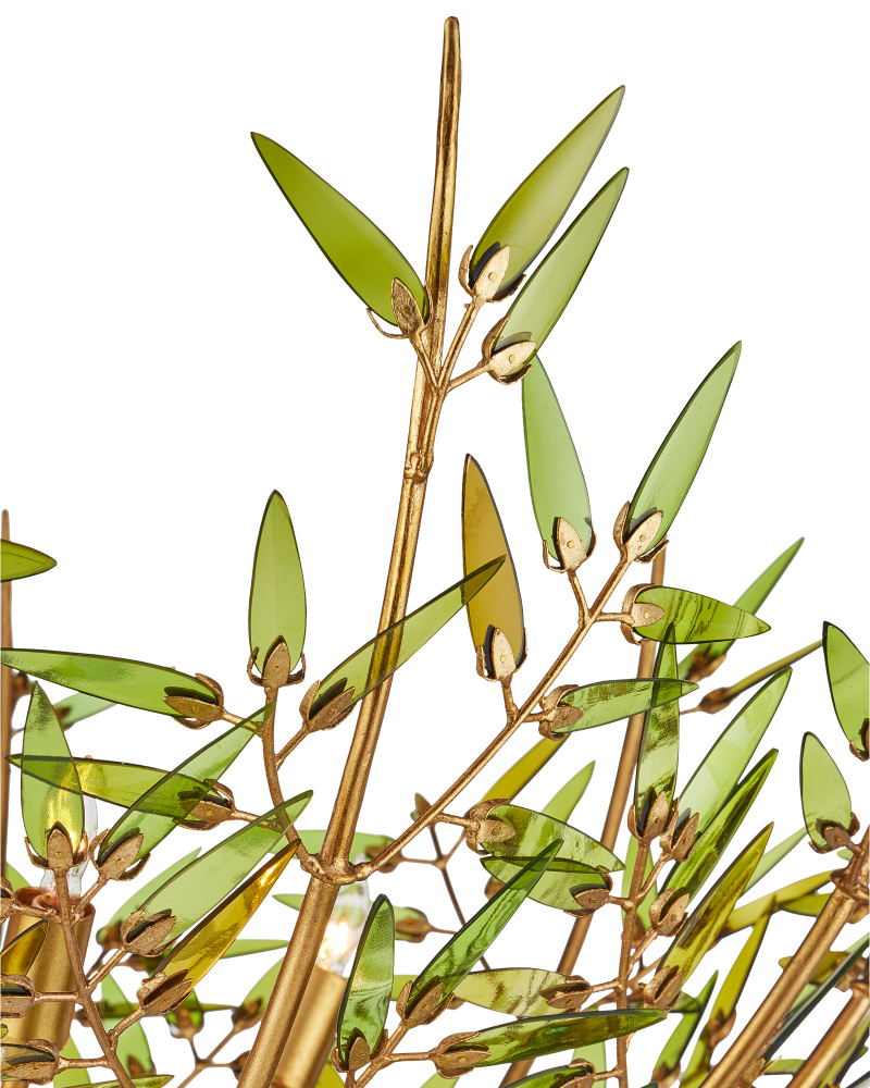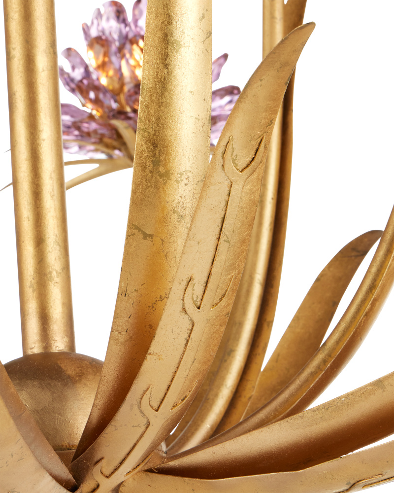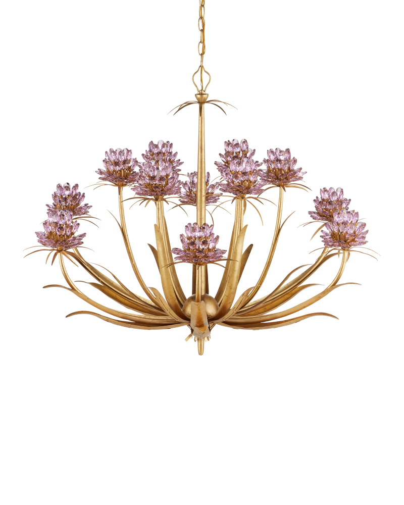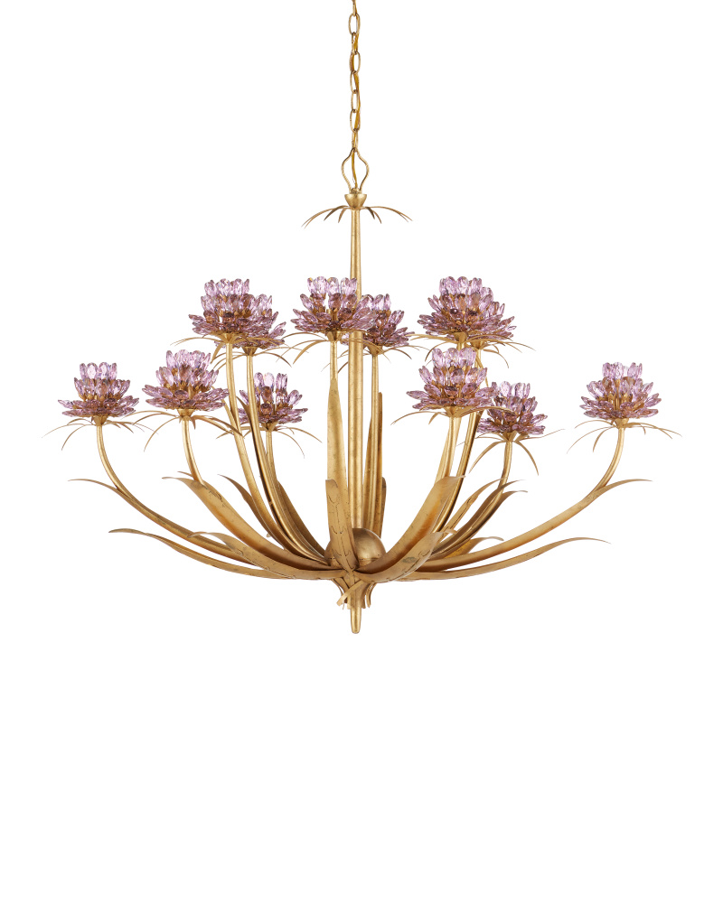The Marilee Large Chandelier is a floral-inspired chandelier in a Dutch Gold Leaf finish with plant-like shapes flowing along each of the arms. The curved rods that make up the frame culminate in crystal blossoms that surround the bulbs, which makes them glow. The tiny palm-shaped details on the top and beneath the blossoms are artful details. The 12-light gold chandelier is dimmable. Adjustable from 39" to 107" with use of included chain/rod kit/cable. If your space calls for a longer drop, additional chain/rods/cable is available for purchase.