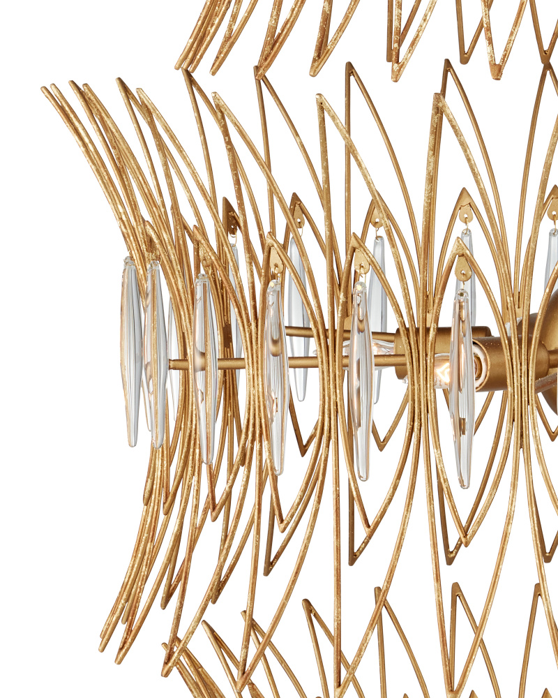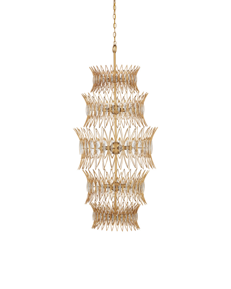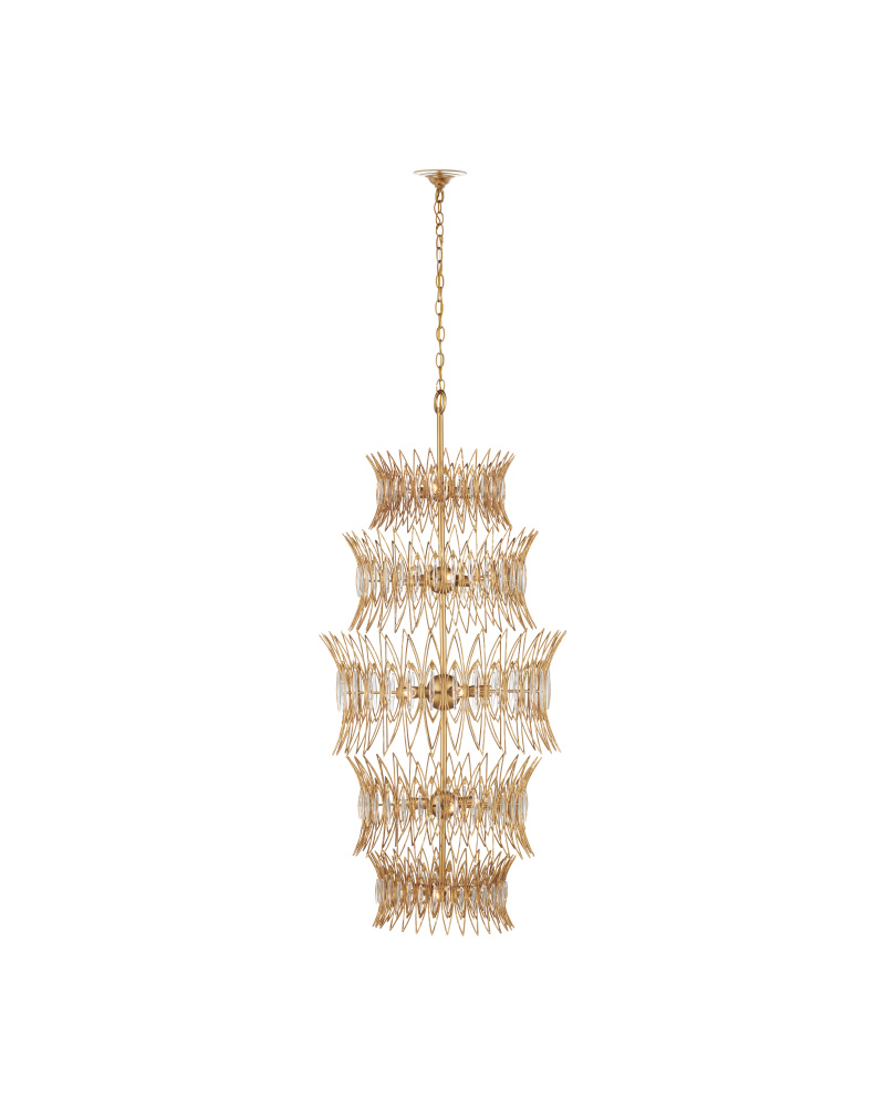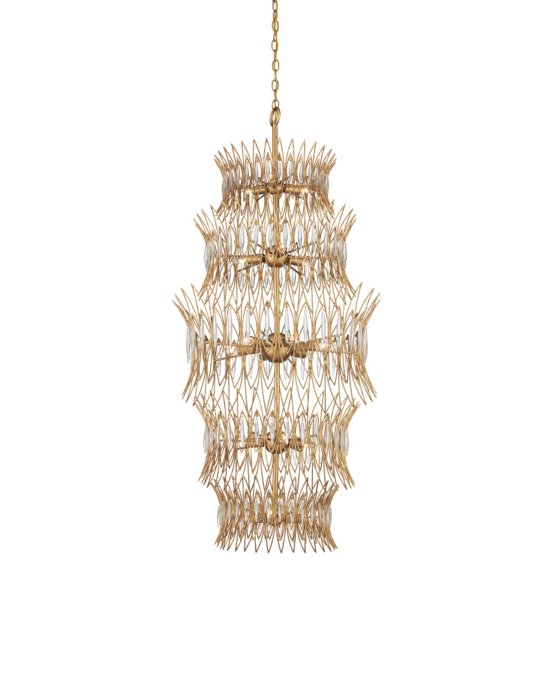The Marquise Large Gold Chandelier is made of slender wrought iron wires in a Luxor gold finish that brings the metal a speckled texture. Inspired by an earring from the mid-century era, the four-tiered crown-like chandelier has abstract leaf designs that flow along the frame, which are fitted with oblong pieces of clear glass to enhance its glow. With 18 lights, this dimmable fixture will shine brightly. Adjustable from 59.5" to 127.5" with use of included chain/rod kit/cable. If your space calls for a longer drop, additional chain/rods/cable is available for purchase.
