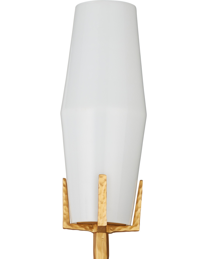 The Mathilda Wall Sconce, Right, has a wallplate and arms made of cast brass in a matt gold finish with markings on their surfaces that look as if they have has been smoothed in place with a palette knife. This brings the sconce a brutalist feel and adds extra texture to the design. The shades on the two-light sconce, made of milky white glass, slide into pronounced prongs that make the sconce look jewelry like. Designed by Marjorie Skouras, with a profile inspired by an antique, the gold sconce is dimmable.