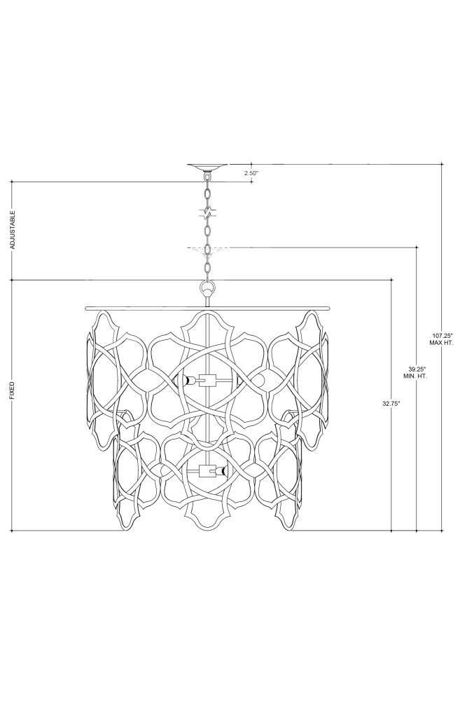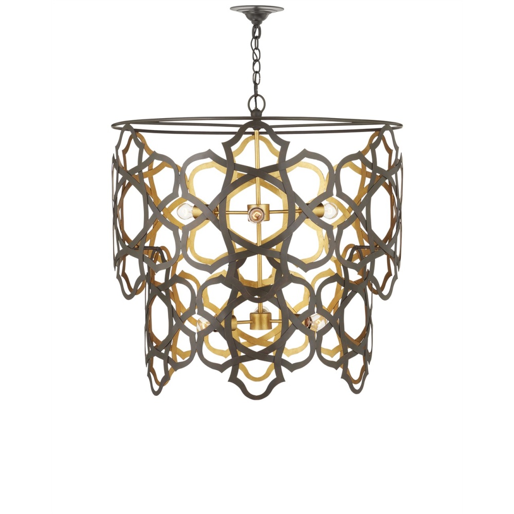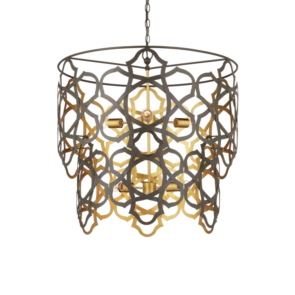 The Mauresque Medium Bronze & Gold Chandelier is made of sculpted bands of wrought iron in a lovely contemporized floral pattern that drips downward. The shade of the gold and black chandelier has contrasting surfaces in bronze gold and contemporary gold leaf finishes, which means the outside reads as black while the inside is bright gold. The organic shape of this fixture is created by metal panels that are laser cut from sheet metal, which takes great concentration to achieve. Adjustable from 39.25" to 107.25" with use of included chain/rod kit/cable. If your space calls for a longer drop, additional chain/rods/cable is available for purchase.