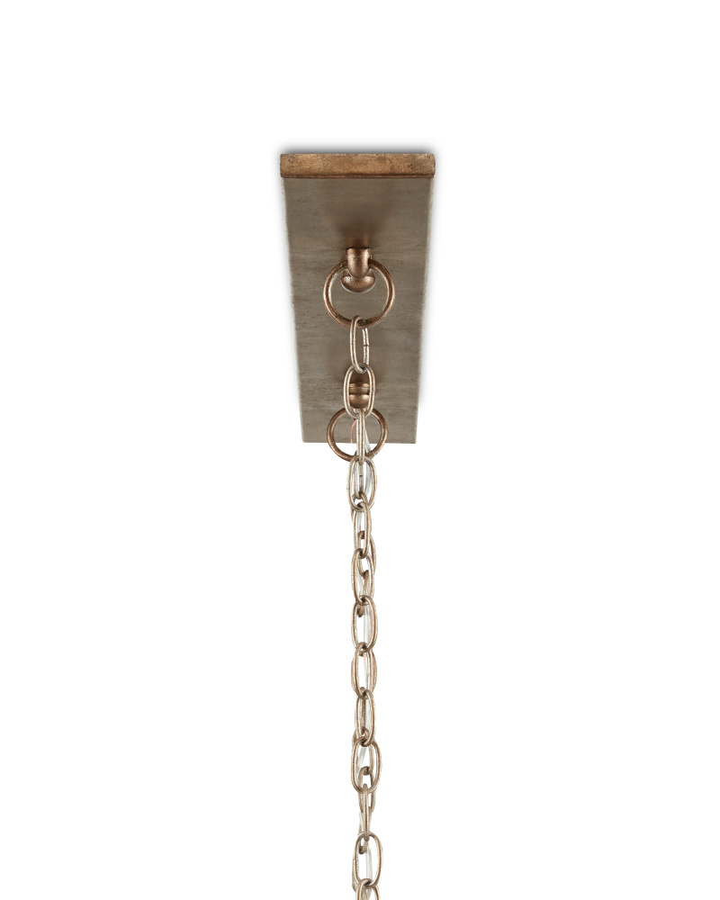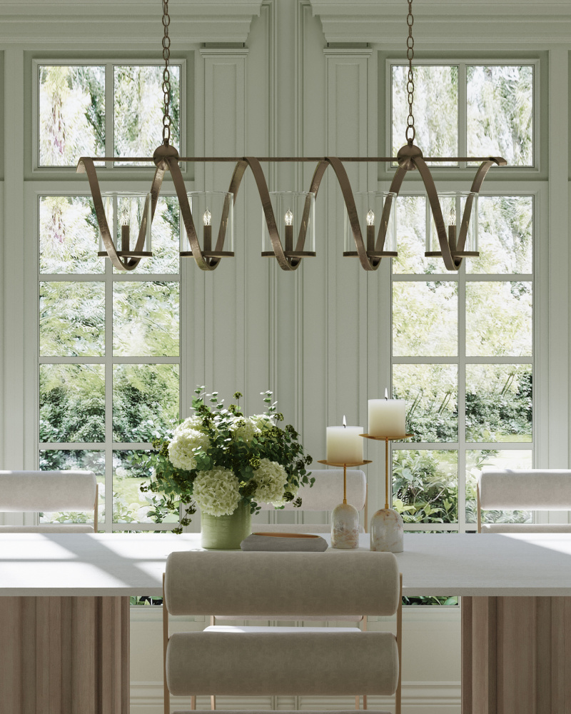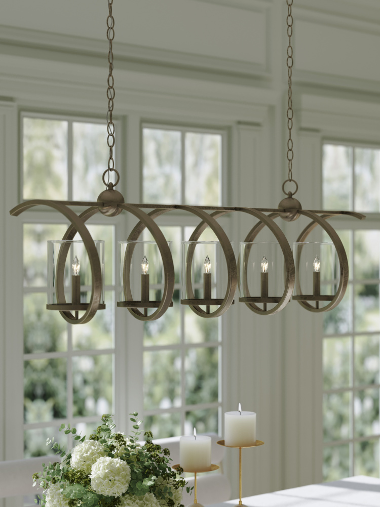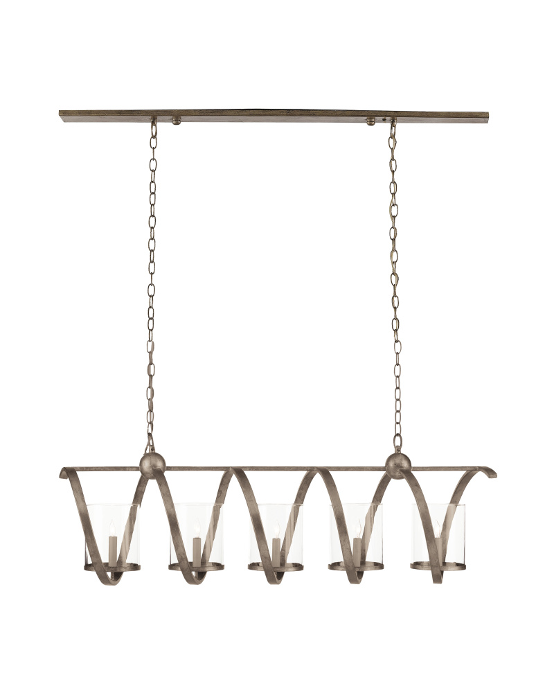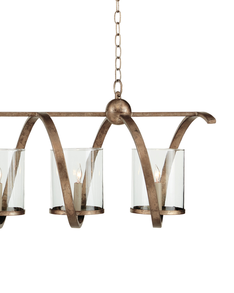 If the Maximus Rectangular chandelier in bronze had its very own lyrics, it would be singing here we go loop de loop! Its wrought iron spirals hold beautiful seeded glass shades perfectly on key. The metal on the fixture has a rich Pyrite bronze finish that has been mottled for a slight textural feel. There is also a Maximus with a washed gold leaf finish.