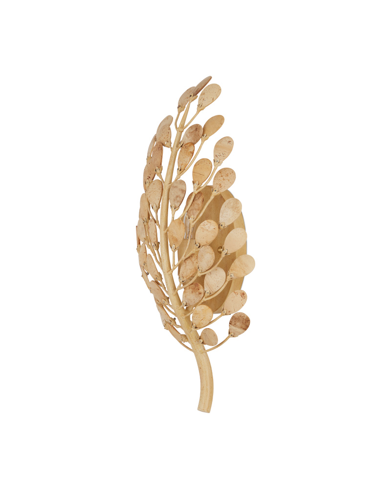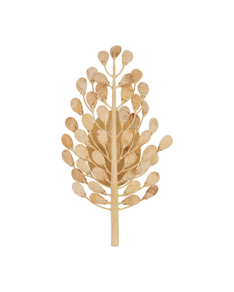 The design of the Maypan Wall Sconce has flowing upward limbs that hold petals made of bleached coconut shells inspired by the fronds that flow from the crown of the palm tree after which it is named. These are tonally in sync with the wallplate, which is made of wrought iron in a coco cream finish, and are fastened to the tree-like shape with tiny brads—the painstaking process a time-intensive one. The one-light sconce is dimmable.
