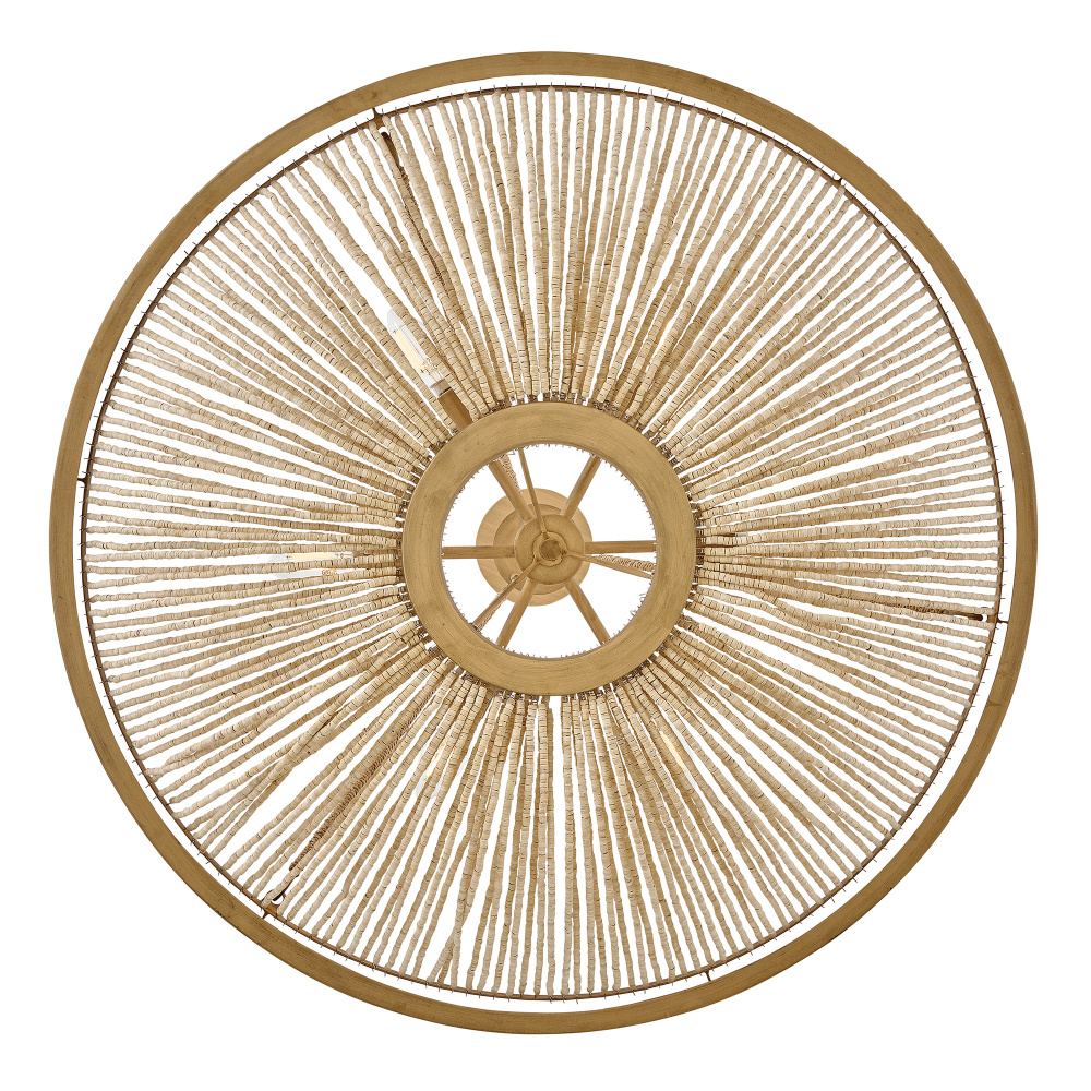 Introduce an element of natural texture and bohemian style to your living space. Tula’s artisan-crafted basket shade is hand-strung with draped strands of coco beads, creating a sheer curtain through which the warm light shines across your room. A hand-painted transitional frame suspended from decorative arms wrapped in natural fiber rope features a Burnished Gold finish with brushed distressed detailing that adds visual depth to the design.