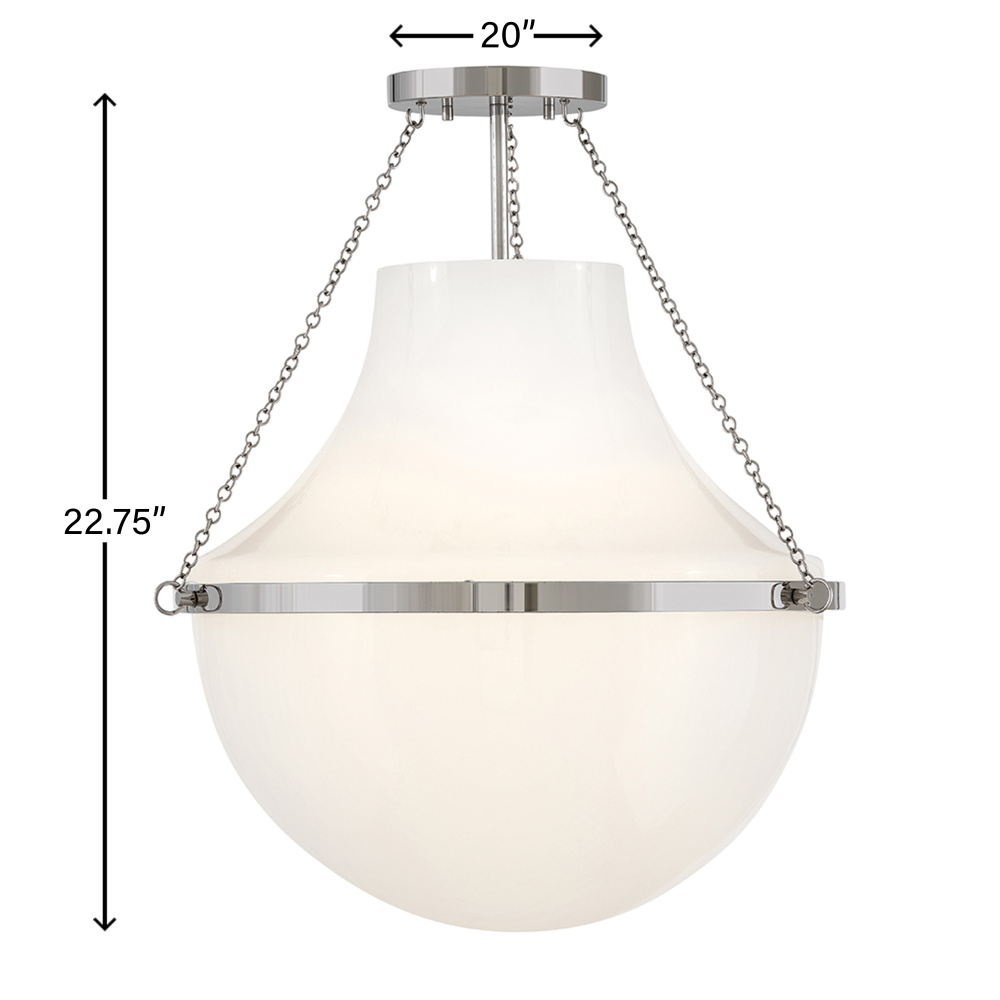 Fusing a sculpted, modern form with classically styled details, Collins features a transitional teardrop shade crafted from blown, cased opal glass. A central metal band and delicate chain uprights are available in Heritage Brass or Black Oxide finishes.