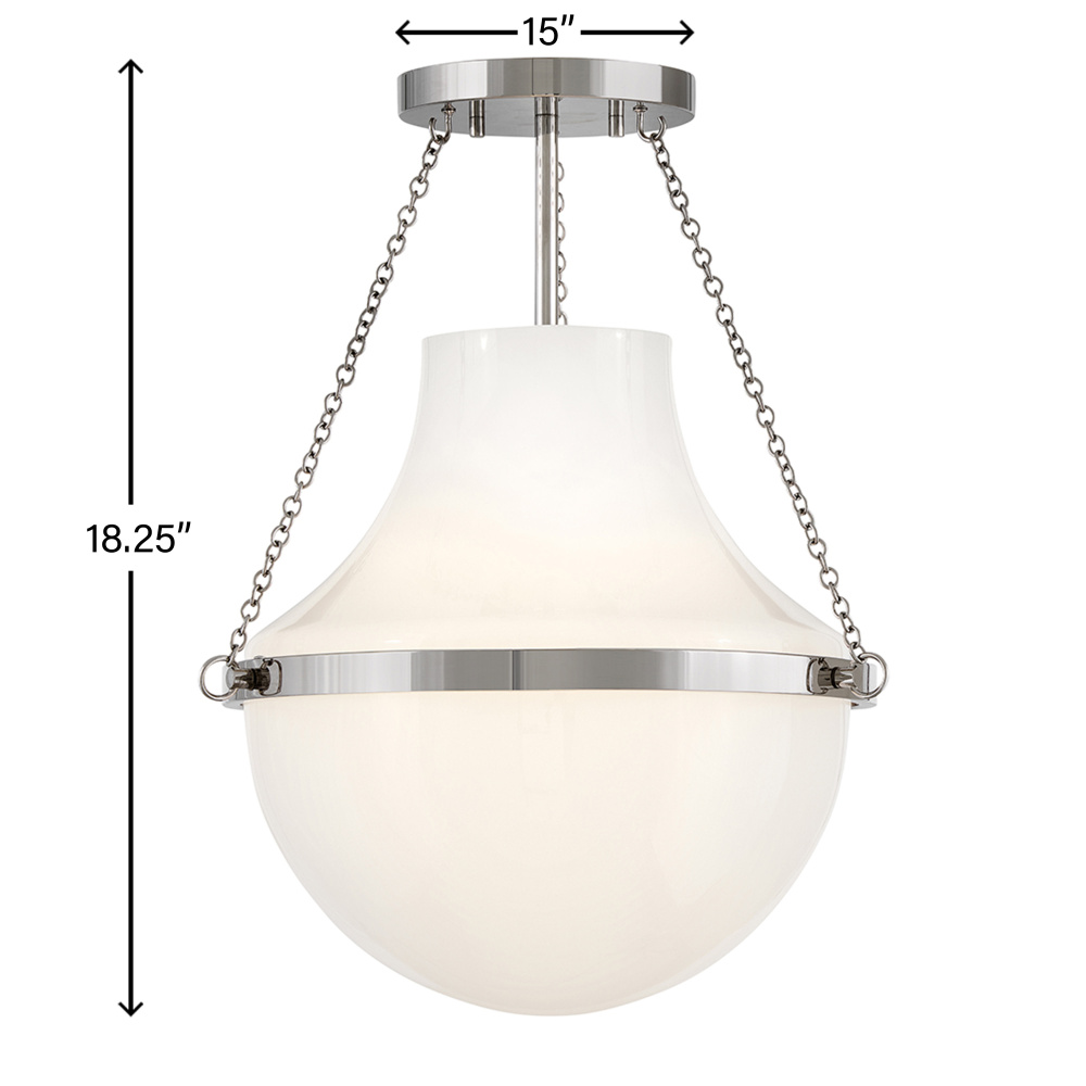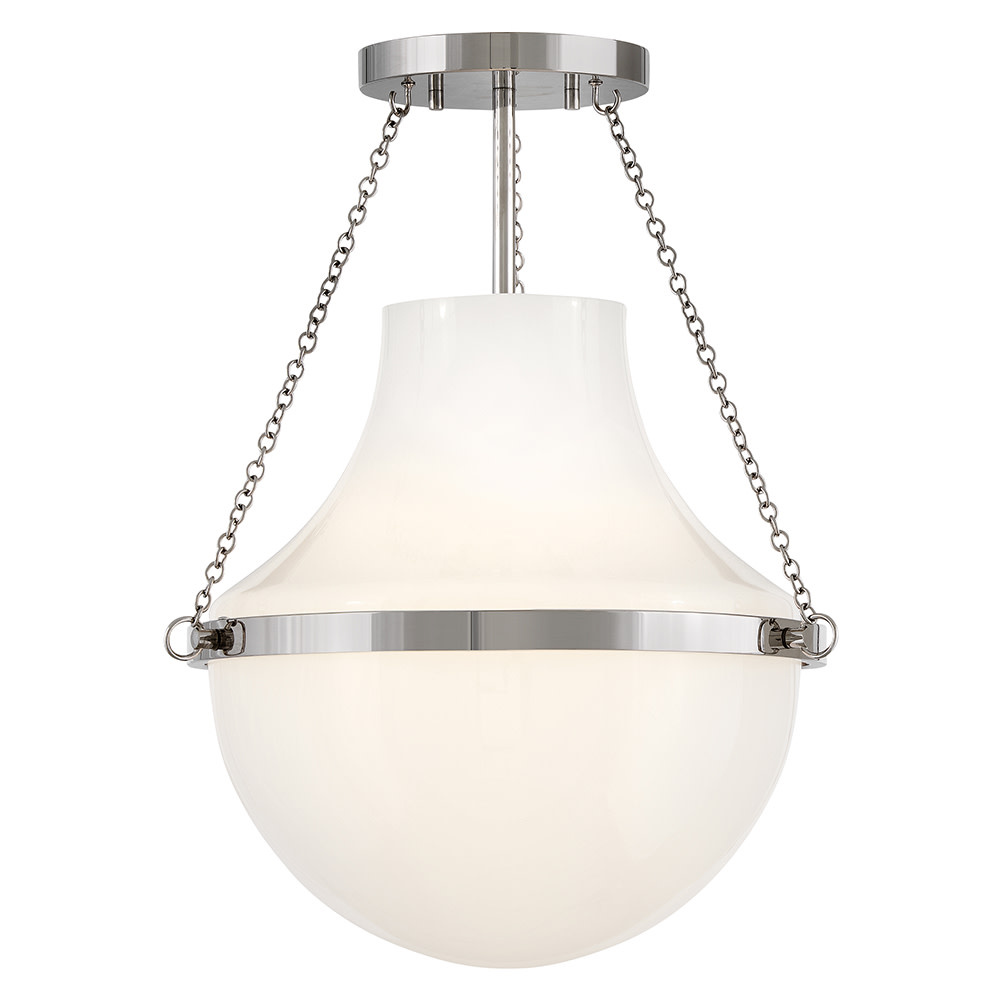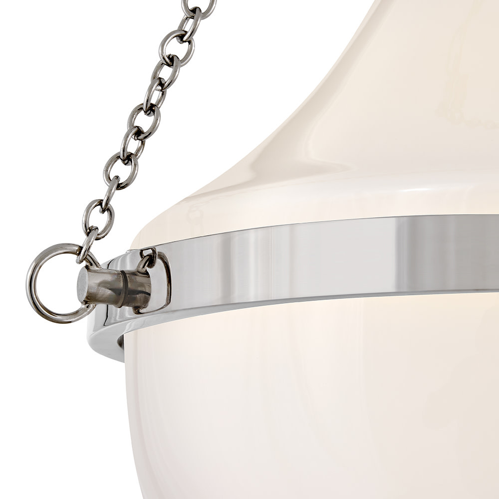 Fusing a sculpted, modern form with classically styled details, Collins features a transitional teardrop shade crafted from blown, cased opal glass. A central metal band and delicate chain uprights are available in Heritage Brass or Black Oxide finishes.