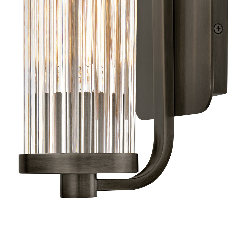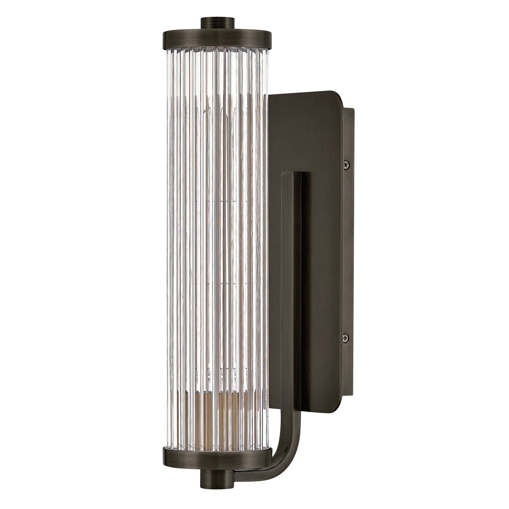 A touch of modern style and vintage charm, Ellery’s Clear glass shade is composed of tall cylindrical glass rods, creating a beautiful reeded effect when illuminated. A large rectangular backplate and matching end caps are finished in a Black Oxide, Heritage Brass, or Polished Nickel finish that complements any bath or living space.