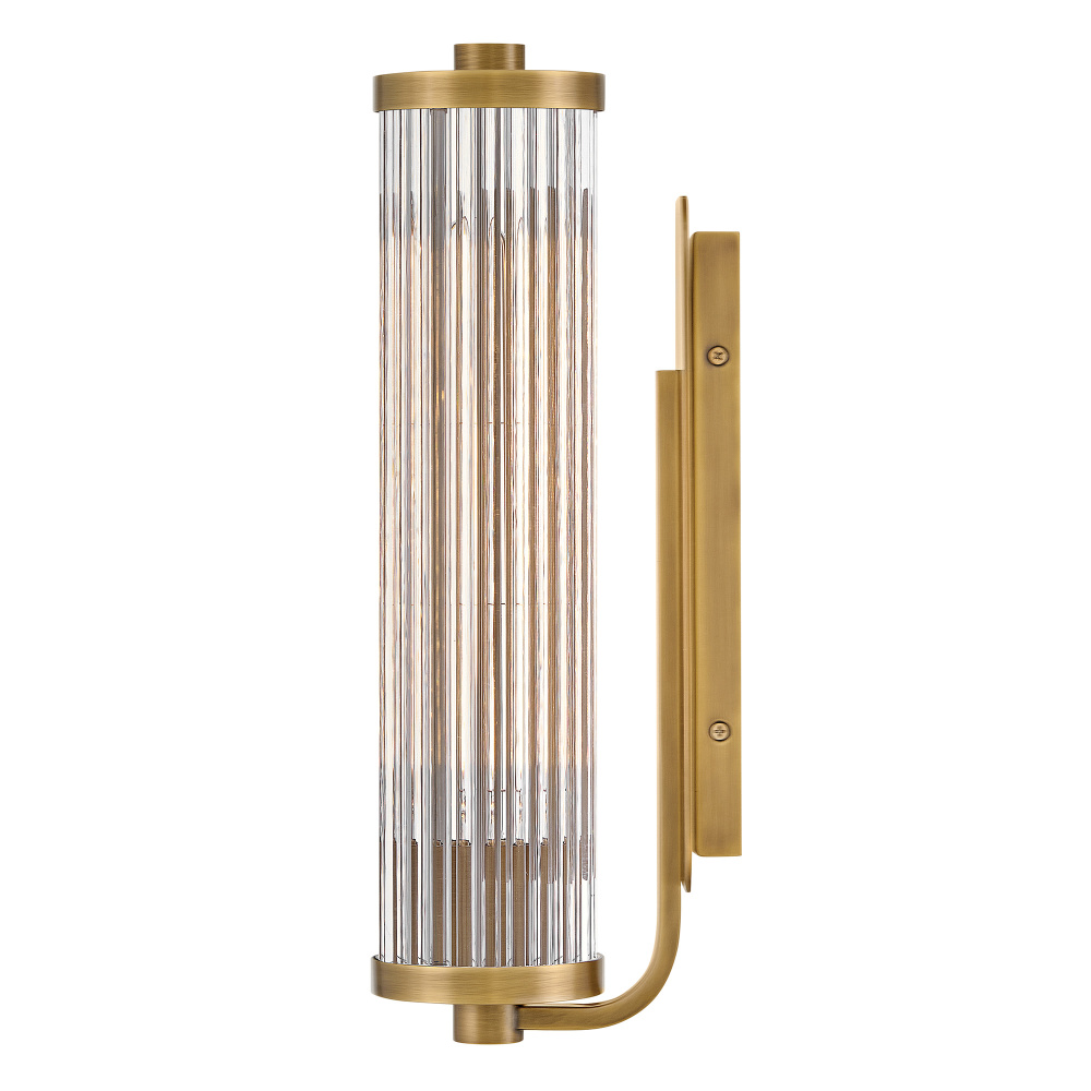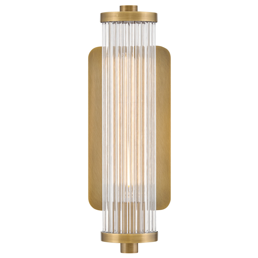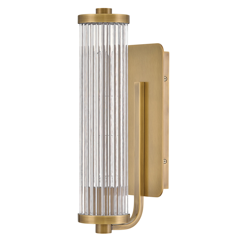 A touch of modern style and vintage charm, Ellery’s Clear glass shade is composed of tall cylindrical glass rods, creating a beautiful reeded effect when illuminated. A large rectangular backplate and matching end caps are finished in a Black Oxide, Heritage Brass, or Polished Nickel finish that complements any bath or living space.