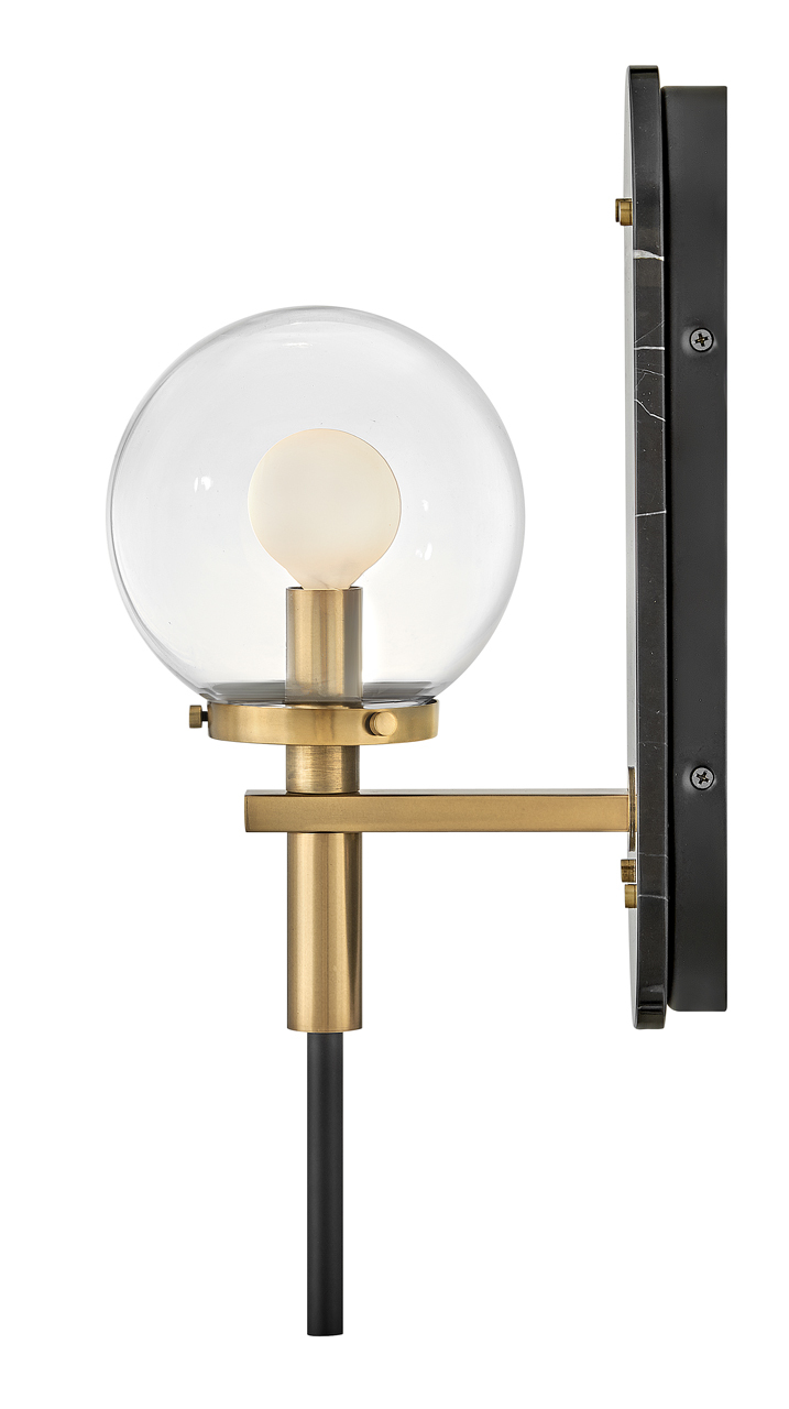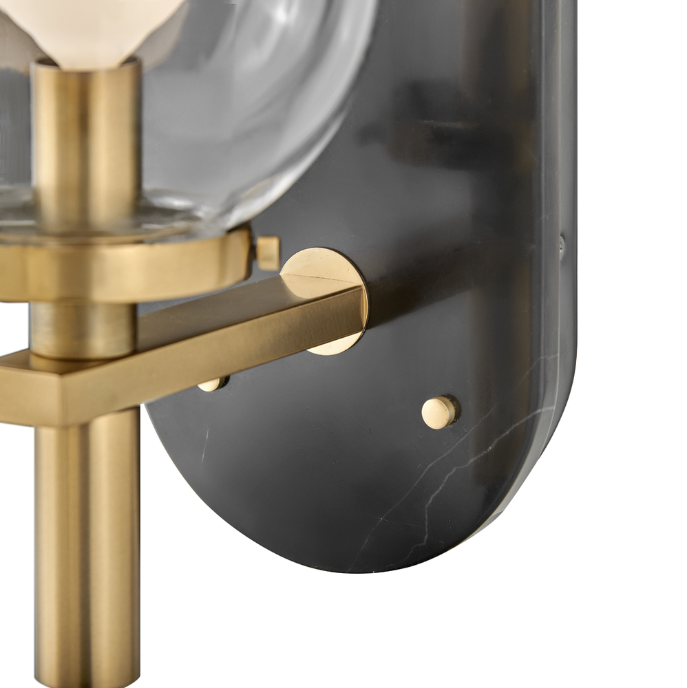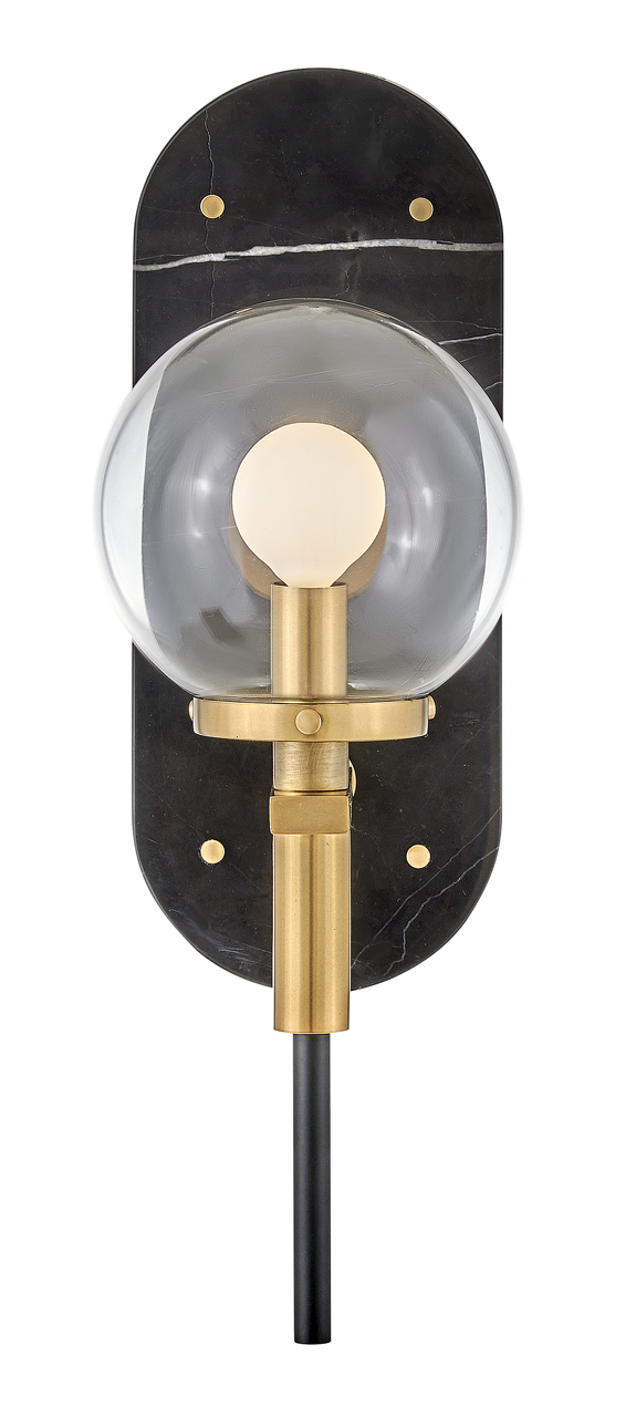 An alluring profile that blends a vintage and modern aesthetic, Gilda is the best of both worlds. This show-stopping sconce showcases a large clear glass globe atop a brass stem with contrasting rivets on a luxurious Black Marble or Faux Alabaster backplate. Gilda features a concealed on/off switch and removable cord and can be hardwired or plugged in.