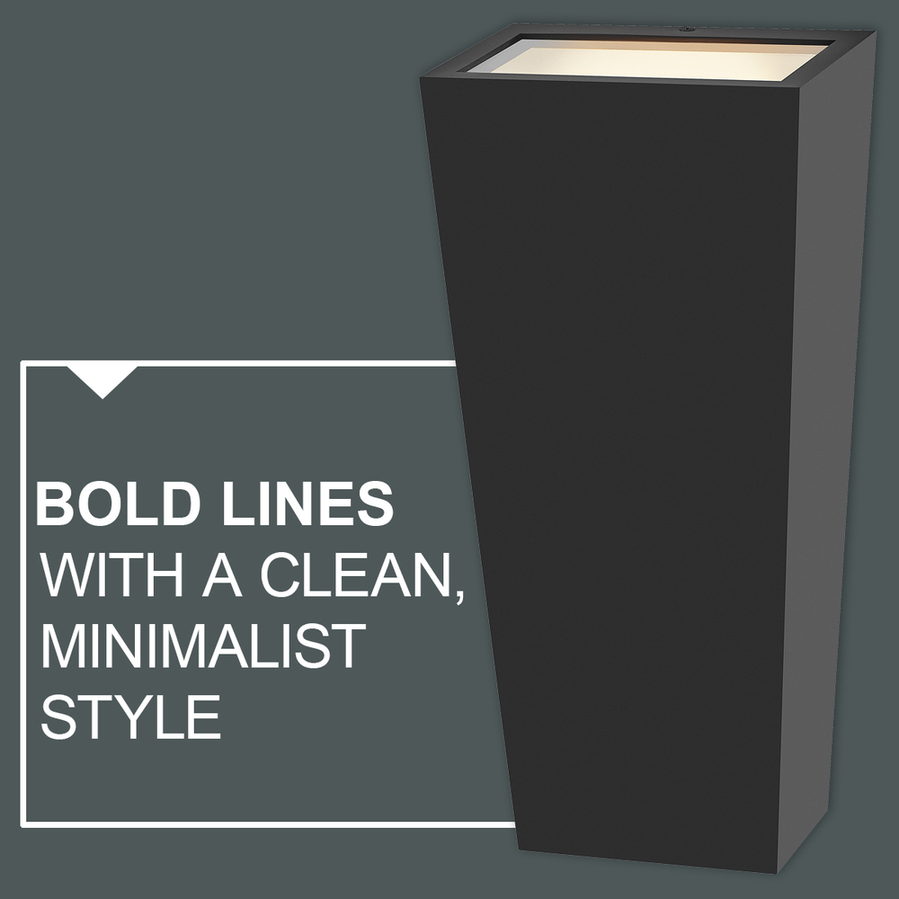 Cruz catches the eye with its modern, sleek design and trapezoidal silhouette. Available in Black and Textured White finish options, Cruz emits a beautiful wall wash illumination through the etched glass to enhance modern façades. Mounting versatility allows individuals to display either the small or large side up or down. LED bulb is included.