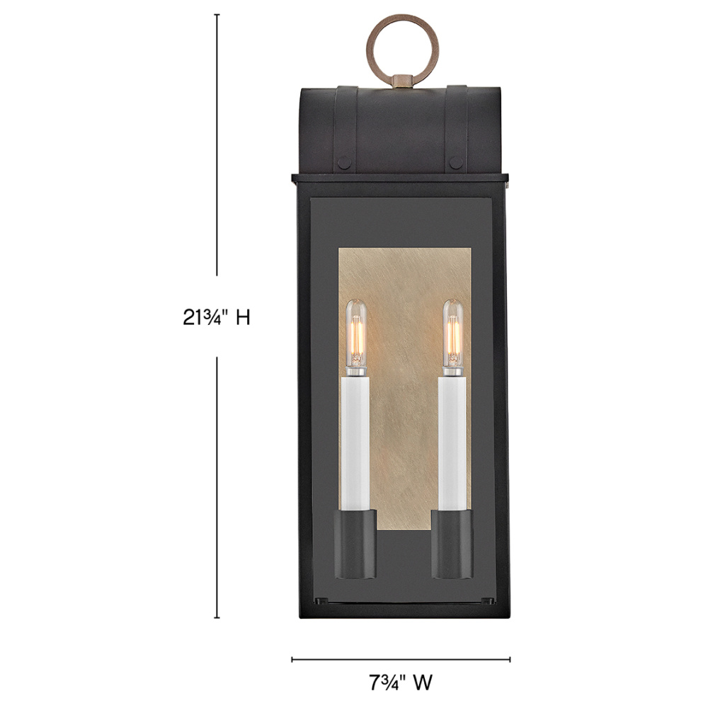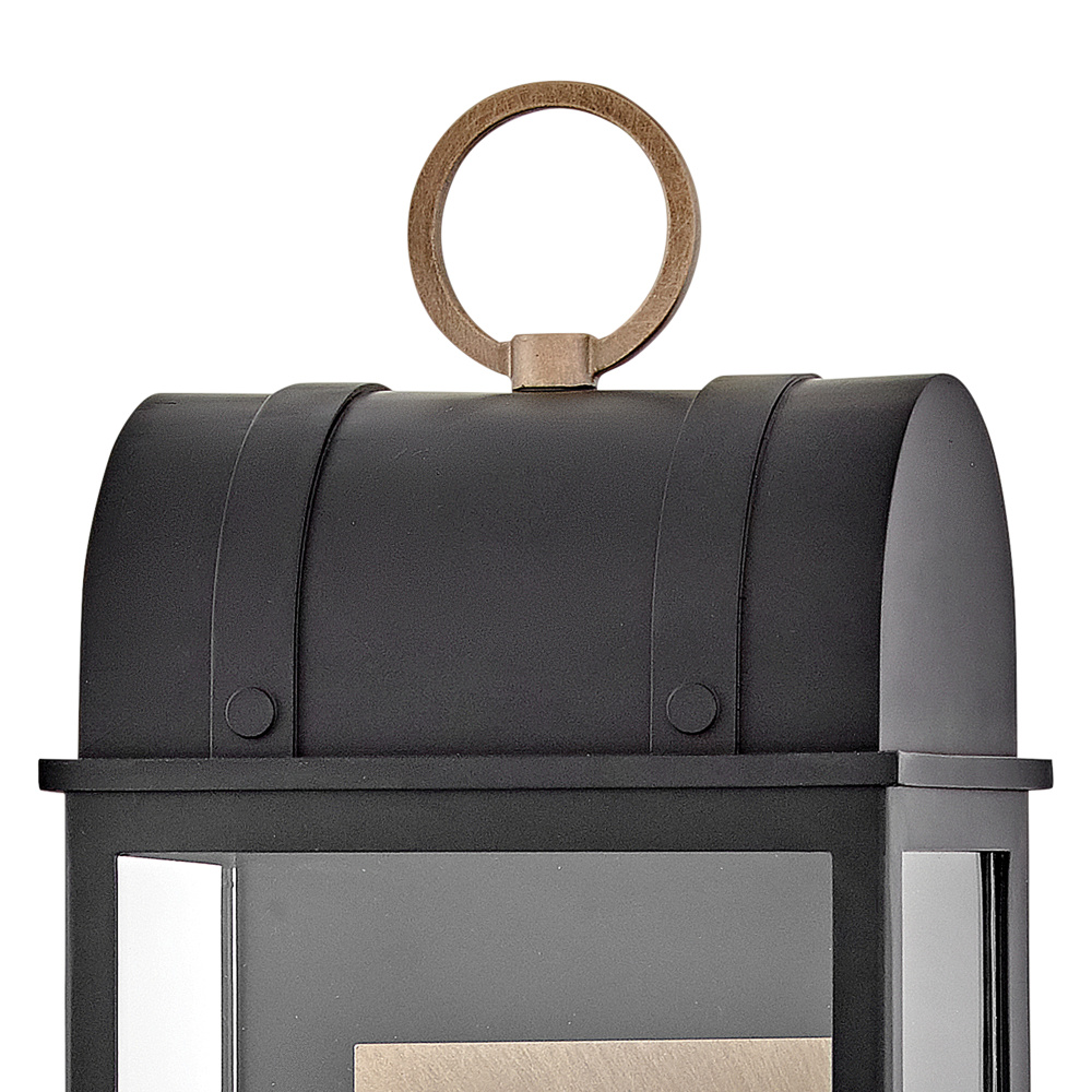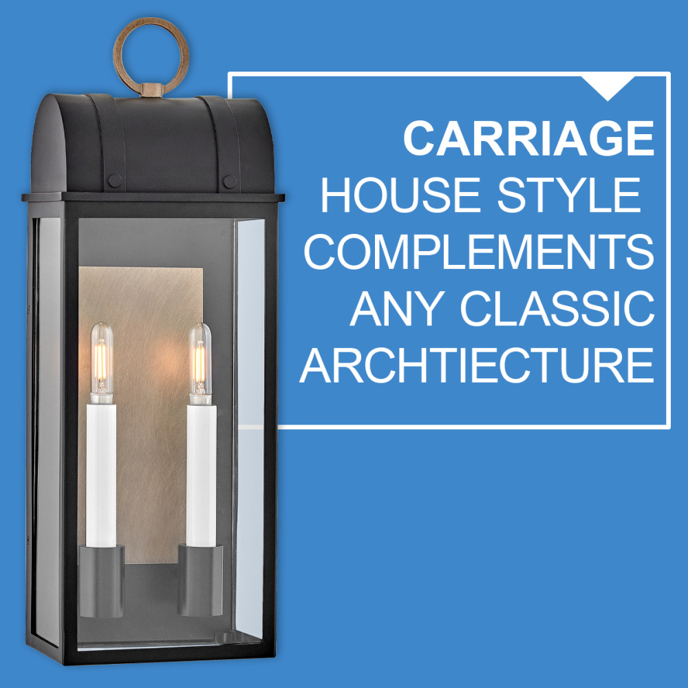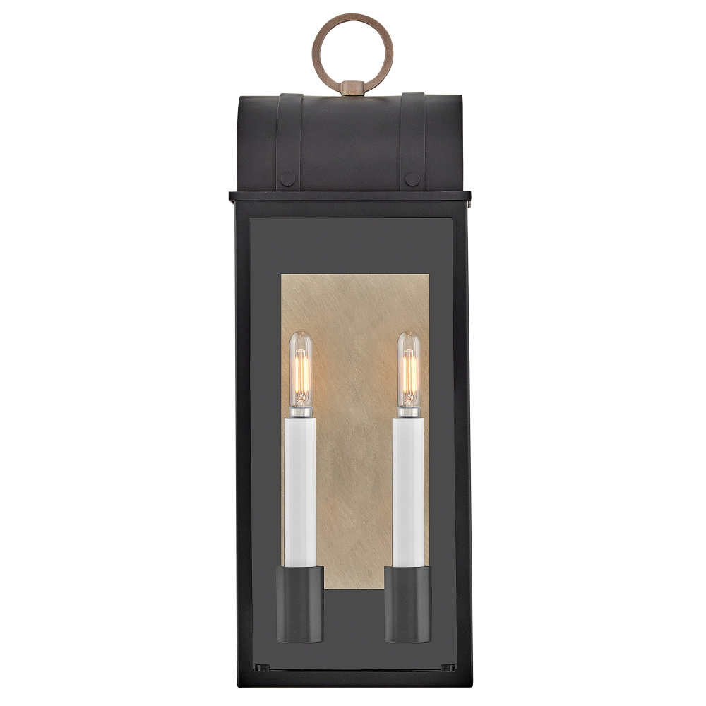 Inspired by traditional colonial lanterns, Campbellās carriage house styling complements classic architecture accentuated by a bold arched roof and a cast top ring. Candelabra lamps with contrasting warm white candle sleeves are enhanced by a Black with Burnished Bronze finish and a reflective backplate.