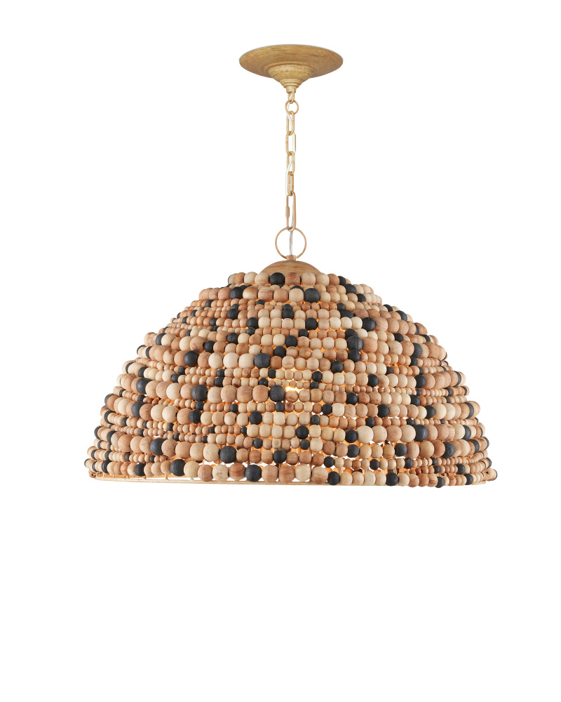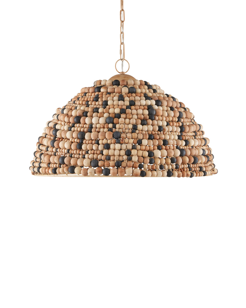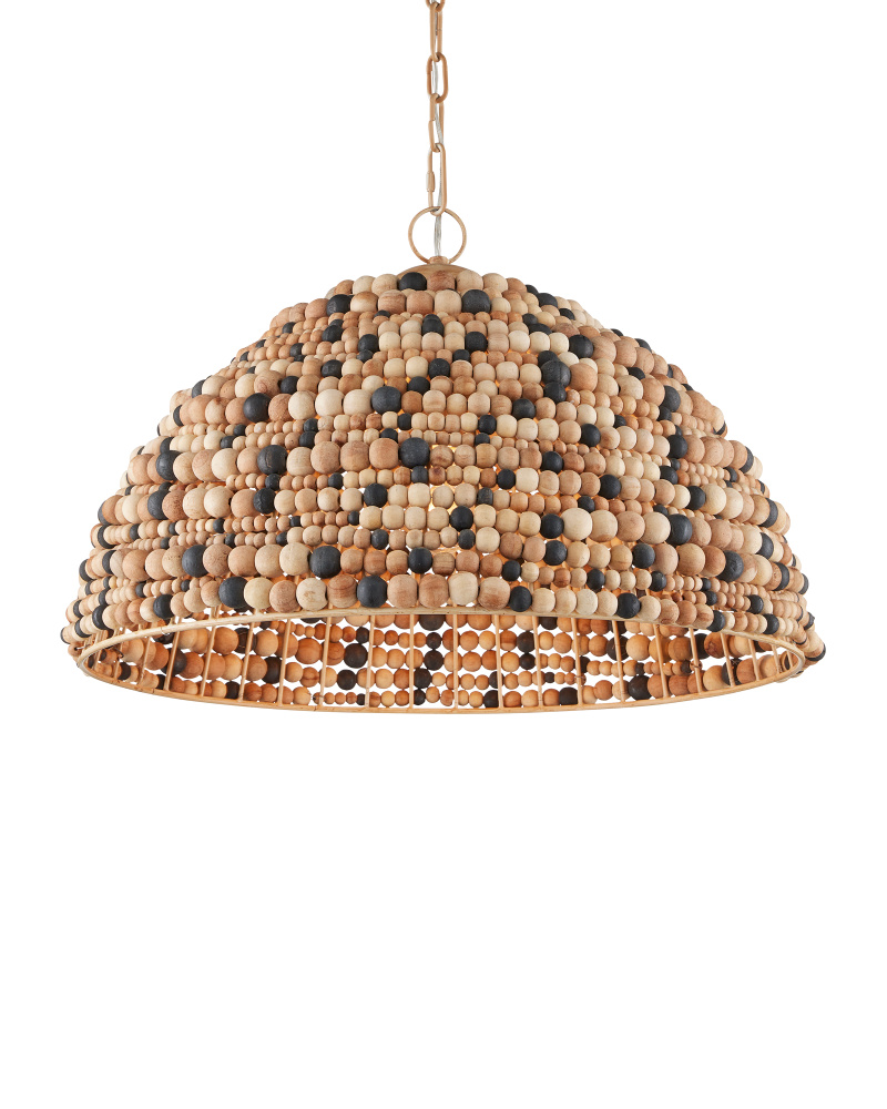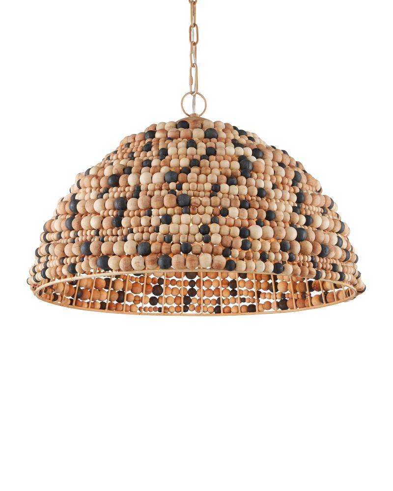 The Medley Pendant features a pebbly texture created by wood beads that vary in size and color—natural, tan, and black. The dome-shaped pendant is thoughtfully designed, with wires welded together to accommodate the different bead sizes. This striking fixture is equally captivating when viewed from underneath. Adjustable from 23" to 90" with use of included chain/rod kit/cable. If your space calls for a longer drop, additional chain/rods/cable is available for purchase.
