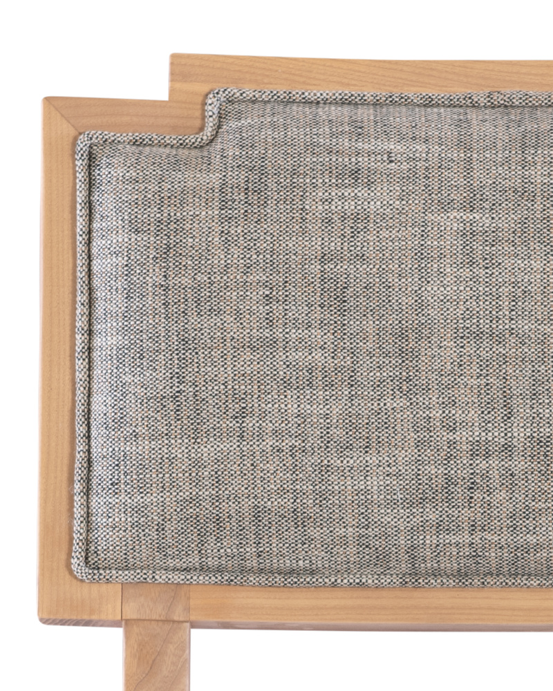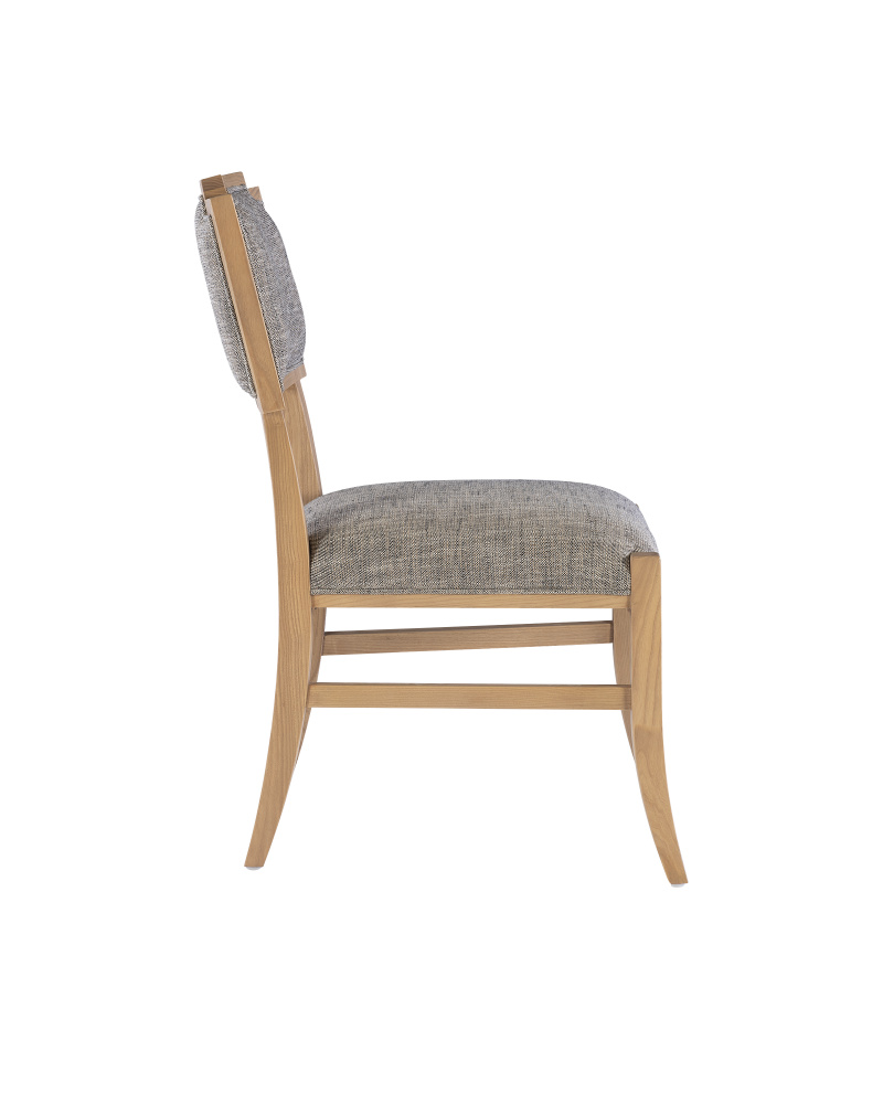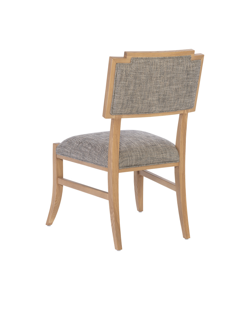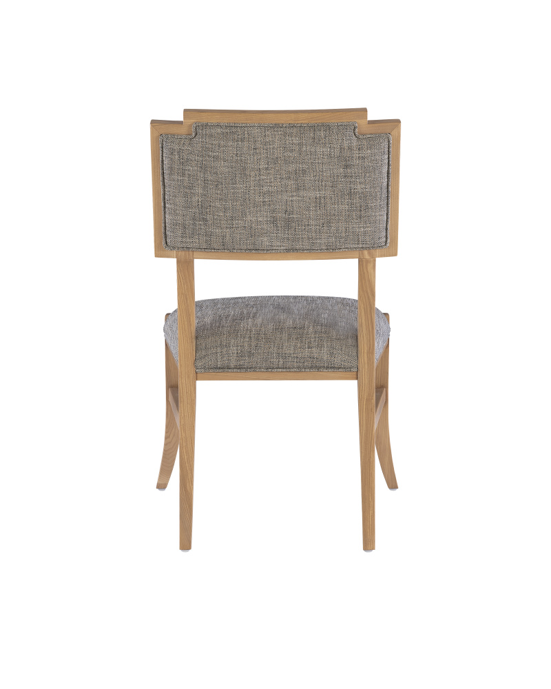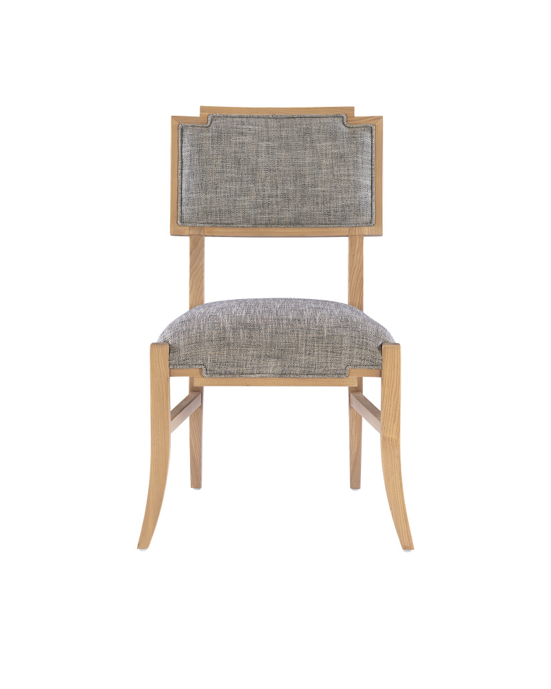 The Melanie Blonde Side Chair is made of ash wood in a blonde ash-wood finish; the slanting legs and the stepped details where the upholstery meets the wood on the seat are reminiscent of Greek stylistic leanings. These aspects of the side chair bring it added personality. The seat, and the front and back of the seatback are covered in a Liller Tortoise performance fabric that has a textural feel.