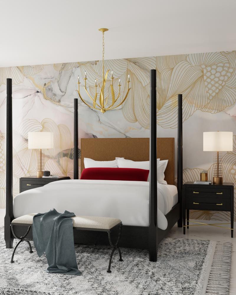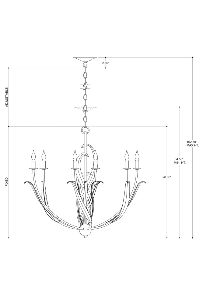 The Menefee Chandelier has swirls of long, slender leaves made of wrought iron in an antique gold leaf finish, which makes the metal gleam. This graceful gold chandelier is one of our offerings that illustrates the dexterity of our artisans, who make this resolute material feel so fluid. Adjustable from 34.5" to 102.5" with use of included chain/rod kit/cable. If your space calls for a longer drop, additional chain/rods/cable is available for purchase.