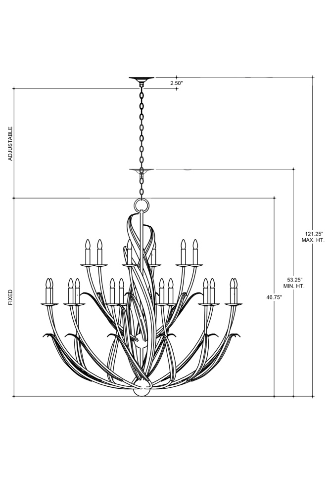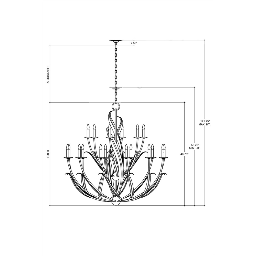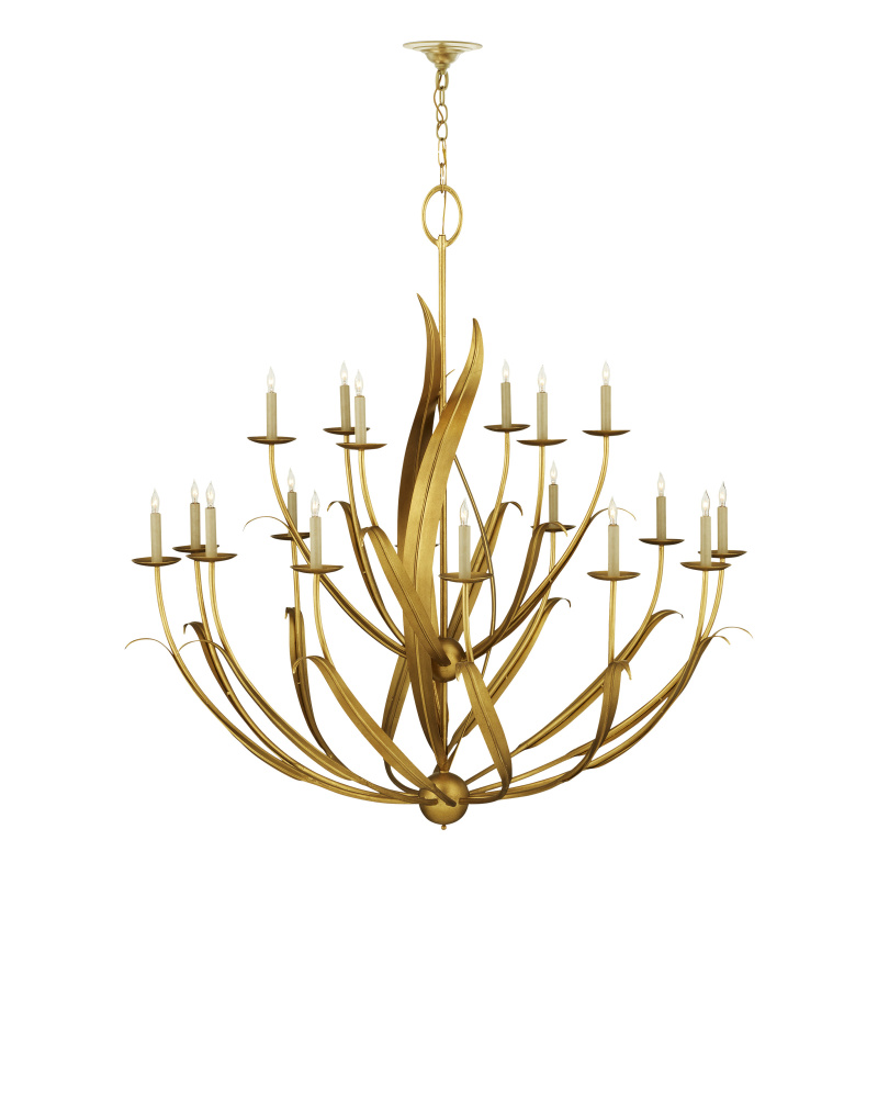 The swirl of long, slender leaves wave as if being stirred by summer breezes on the Menefee Large Gold Chandelier. The hand-applied antique gold leaf finish makes the wrought iron gleam on this transitional, nature-inspired form, whether the lights are switched on or not. This fixture is a statement piece at 50-inches in diameter, so it is perfect for statuesque foyers, open great rooms, or any room with high ceilings and/or expansive floor plans. Adjustable from 53.25" to 121.25" with use of included chain/rod kit/cable. If your space calls for a longer drop, additional chain/rods/cable is available for purchase.