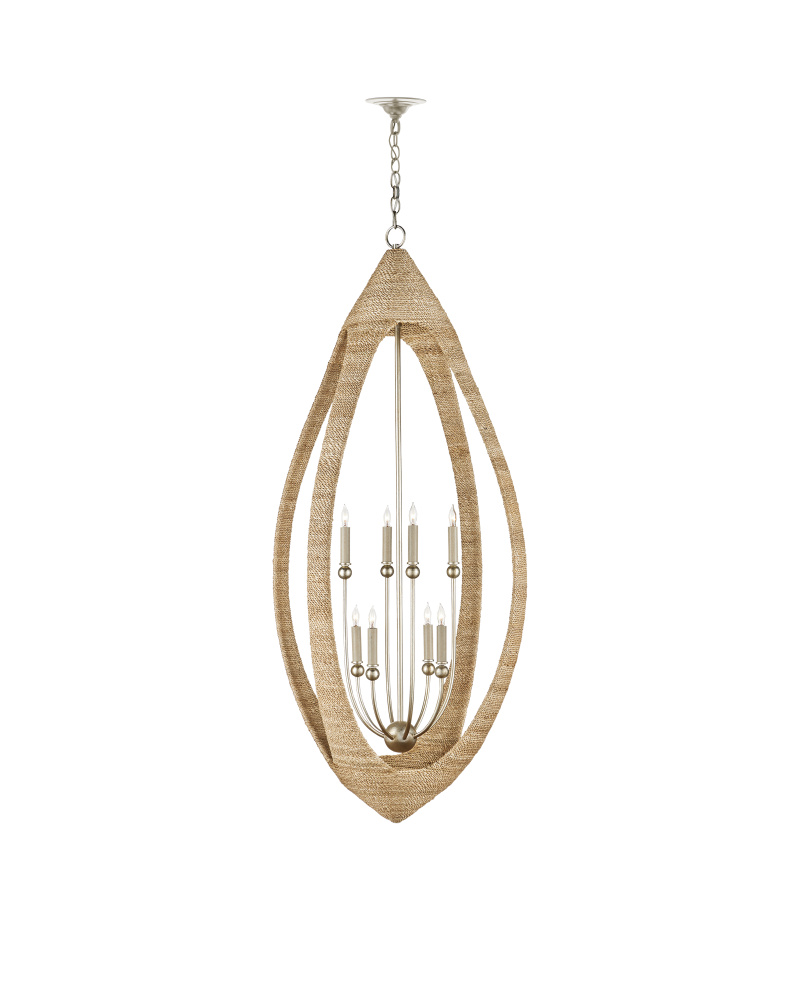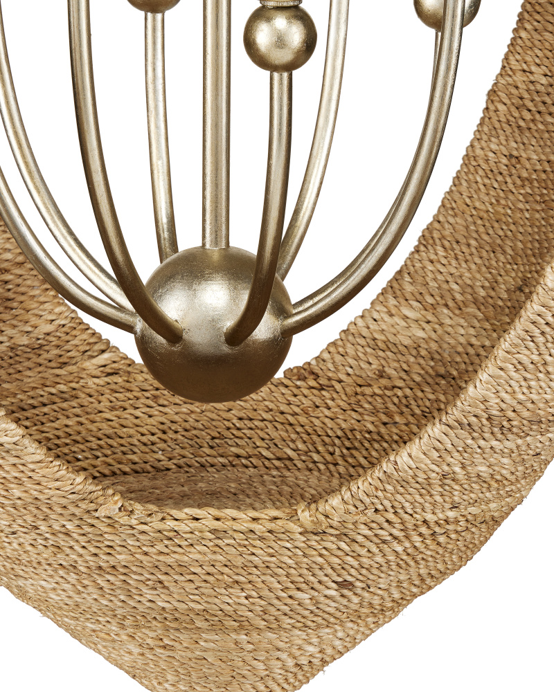 The Menorca Chandelier takes its inspiration from the shape of a football, making this rope chandelier truly unique. Just as it takes a trained professional to throw the ball perfectly, it requires skilled artisans to wrap the abaca rope around the metal laser-cut frame in its intricate open shape so that it appears seamless. The contemporary silver leaf finish adds a luminous touch. Adjustable from 58.50" to 128" with use of included chain/rod kit/cable. If your space calls for a longer drop, additional chain/rods/cable is available for purchase.