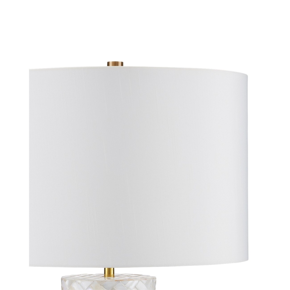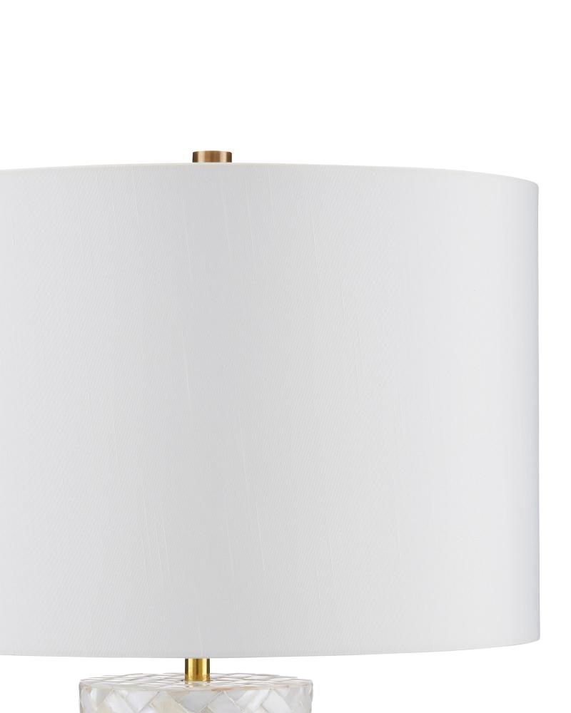 The Meraki Mother-of-Pearl Table Lamp was designed to be the luminous element in a room. The brilliance of the mother-of-pearl columnar body will bring sheen to a space even when the lights are switched off. Each piece of the natural material is cut and hand-applied, and the white lamp has a textural feel because the thickness of the shell varies from piece to piece. The gold finish on the metal teases out the warmer tones in the material, and the off-white shantung shade echoes the pale swaths of the shell.