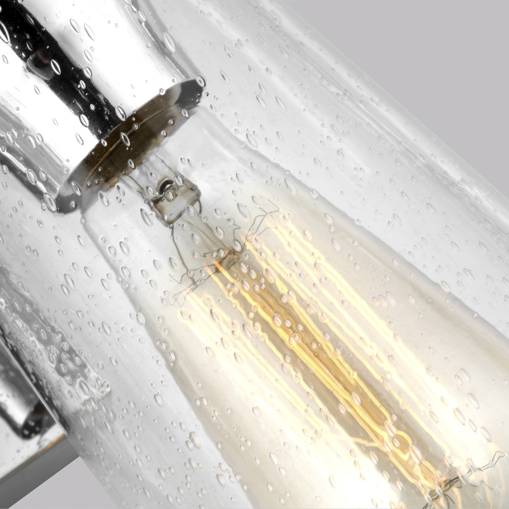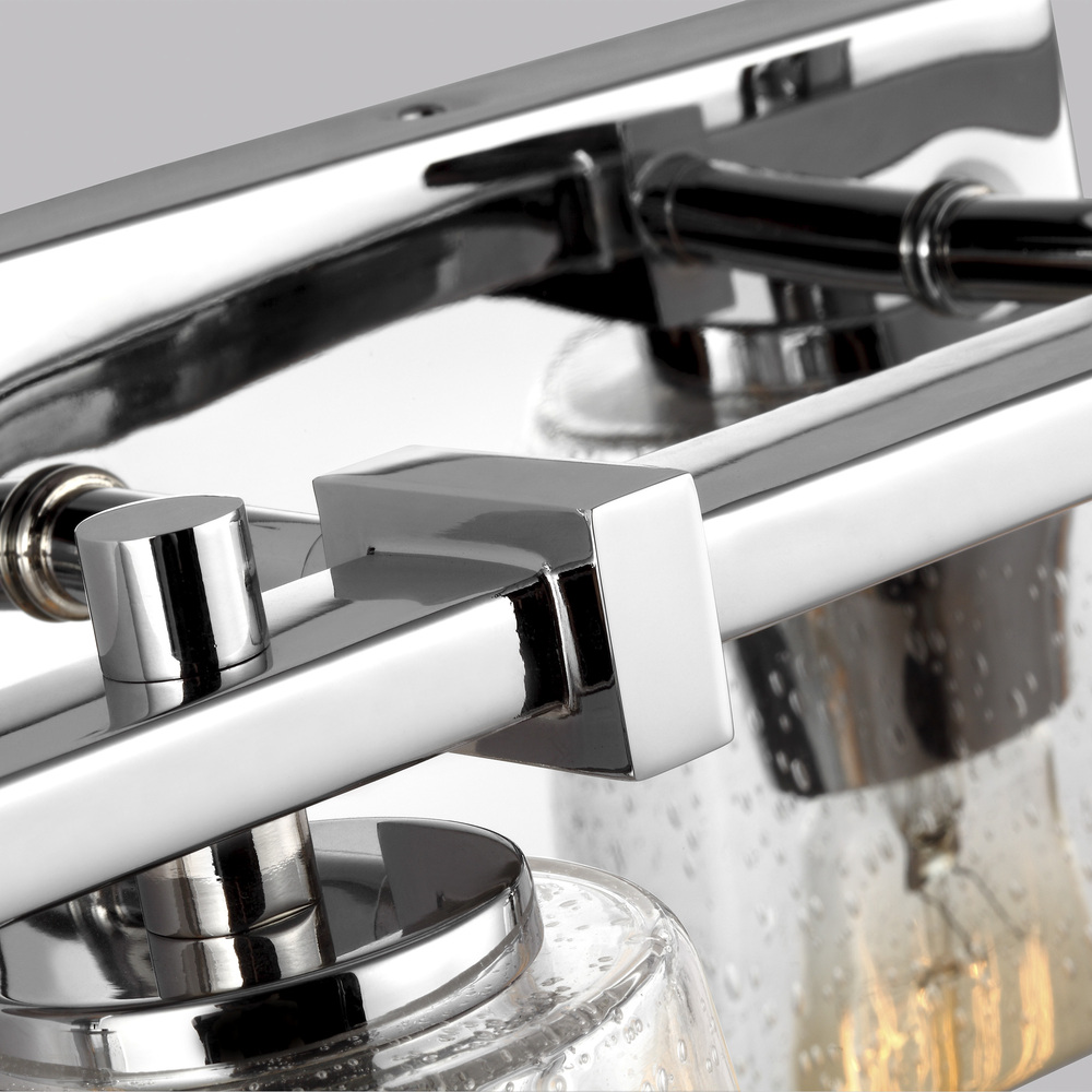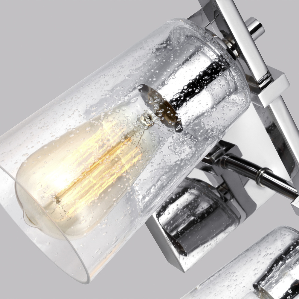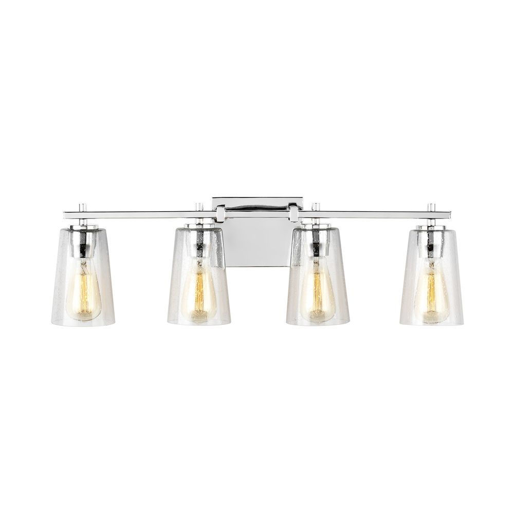 The Sean Lavin Mercer four light vanity fixture in chrome provides abundant light for your bath vanity, while adding a layer of today's style to your interior design. Modern details, like the clean square supports of the cross arm and sleek, rectangular backplate, are defining features of the Mercer. Choose from either refreshingly bright Chrome or warm, rustic Oil Rubbed Bronze hardware for a distinct look, both with tapered Clear Seeded glass shades that complete the tailored look.