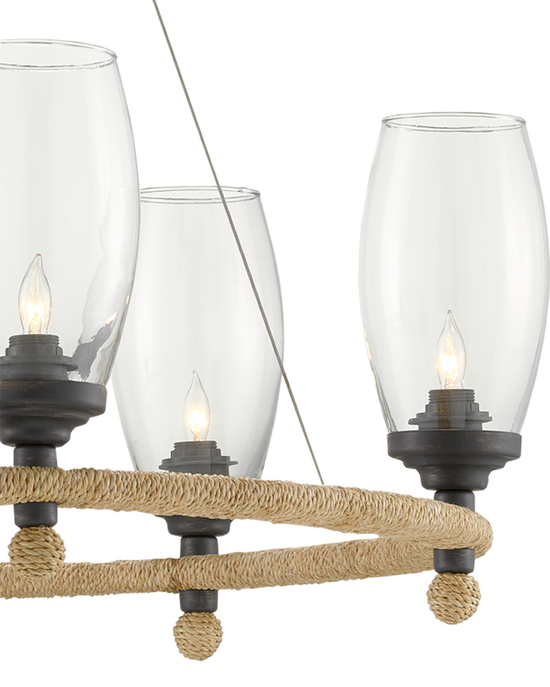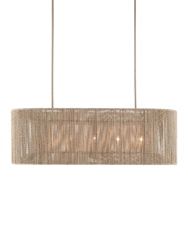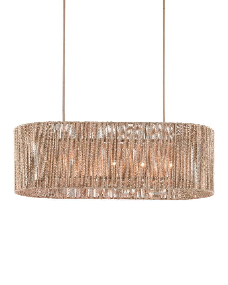 The Mereworth Oval Chandelier has an oblong wrought iron frame around which natural abaca rope has been painstakingly wrapped to create its shade. The rope chandelier emits a warm glow thanks to the color of the abaca. The material also lends the chandelier a nautical feel that makes it perfect for seaside retreats and oceanfront homes. Adjustable from 22" to 64" with use of included chain/rod kit/cable. If your space calls for a longer drop, additional chain/rods/cable is available for purchase.