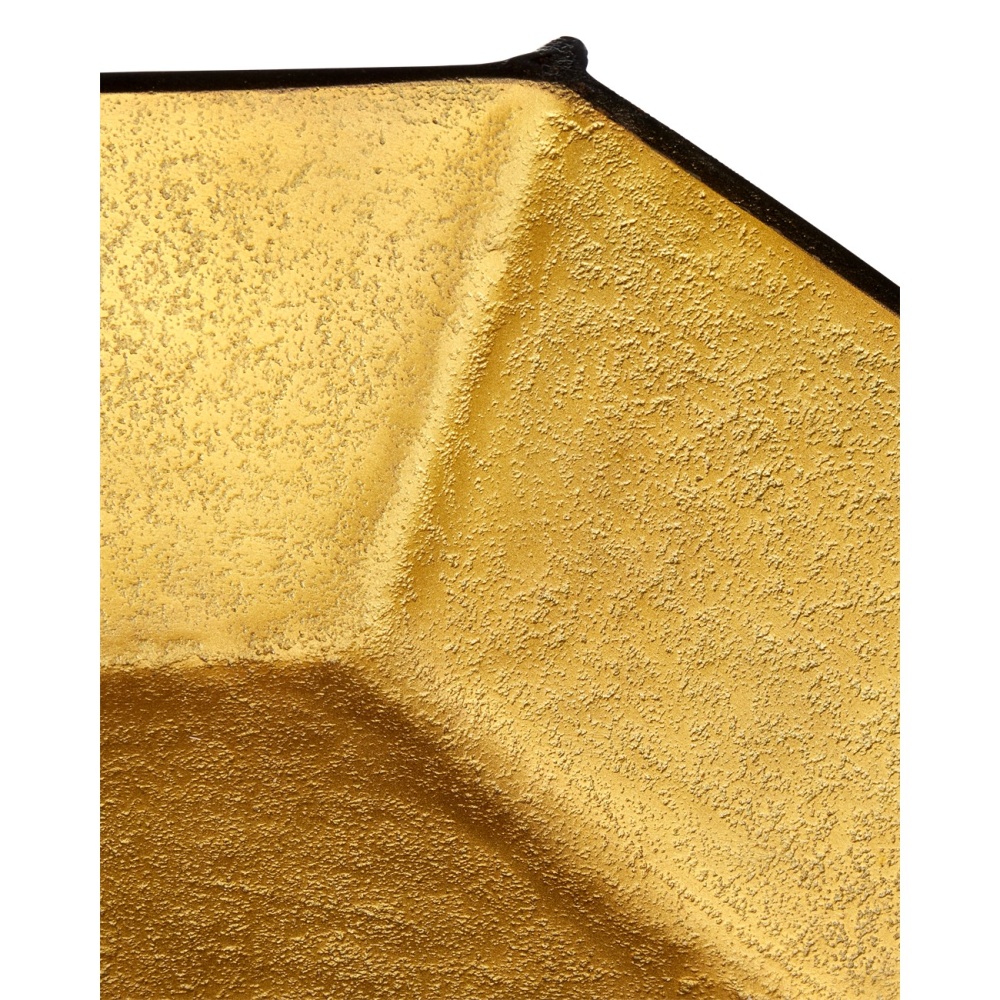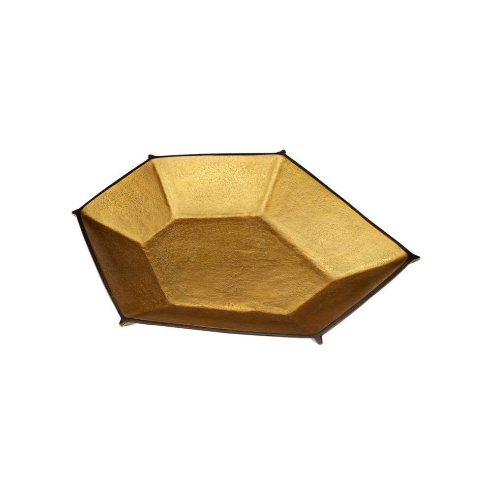 The Merola Antique Brass Bowl is an asymmetrical decorative accessory with angular surfaces that make it a sculptural piece. The antique brass finish gleams on both the interior and exterior of the bowl, while the outside has a bronze finish hand-rubbed into its top-most rims. Made of cast aluminum, the artisanship of a poured metal piece is evident in the stippling on the surfaces of this gold decorative bowl.
