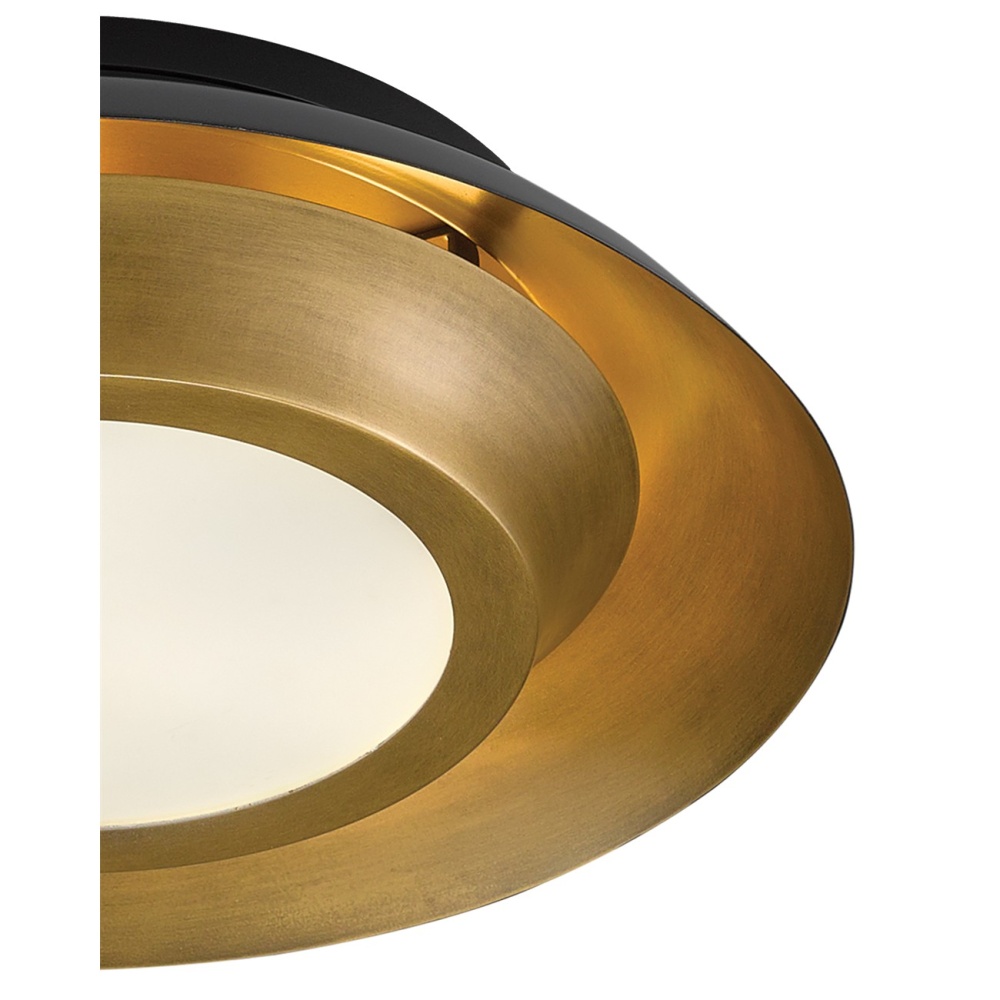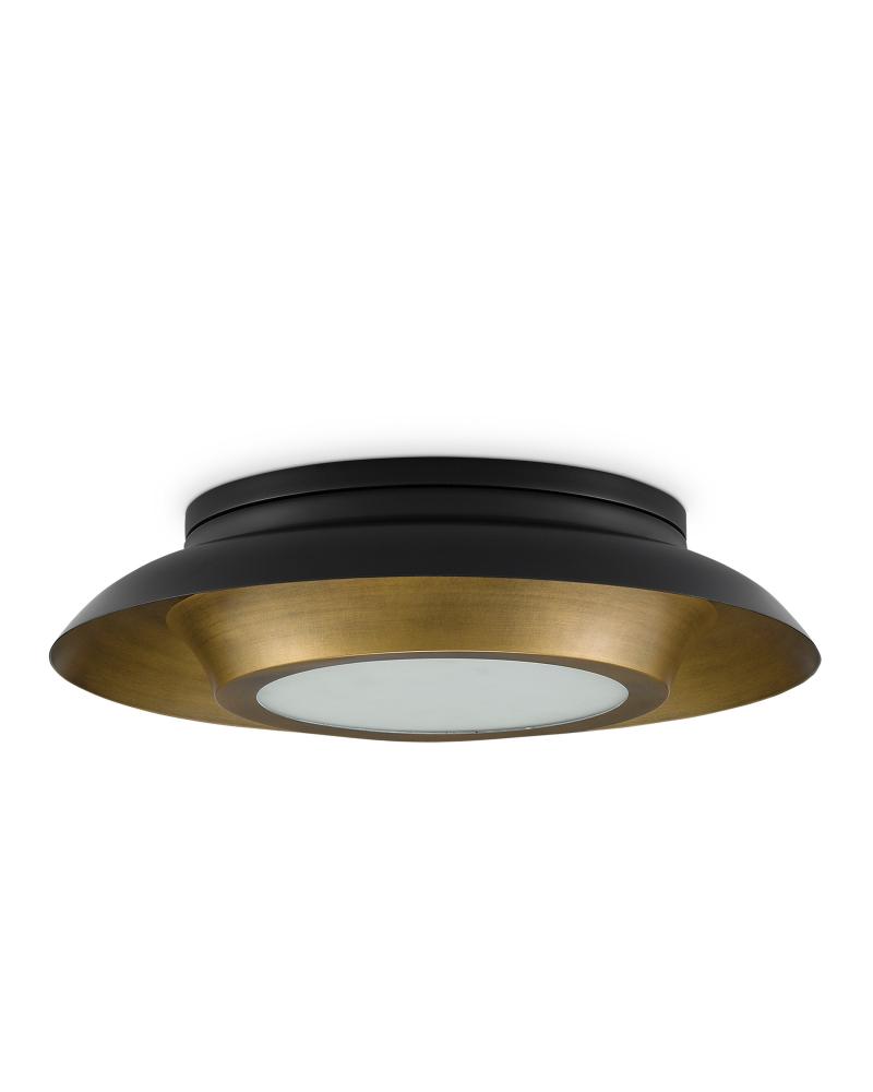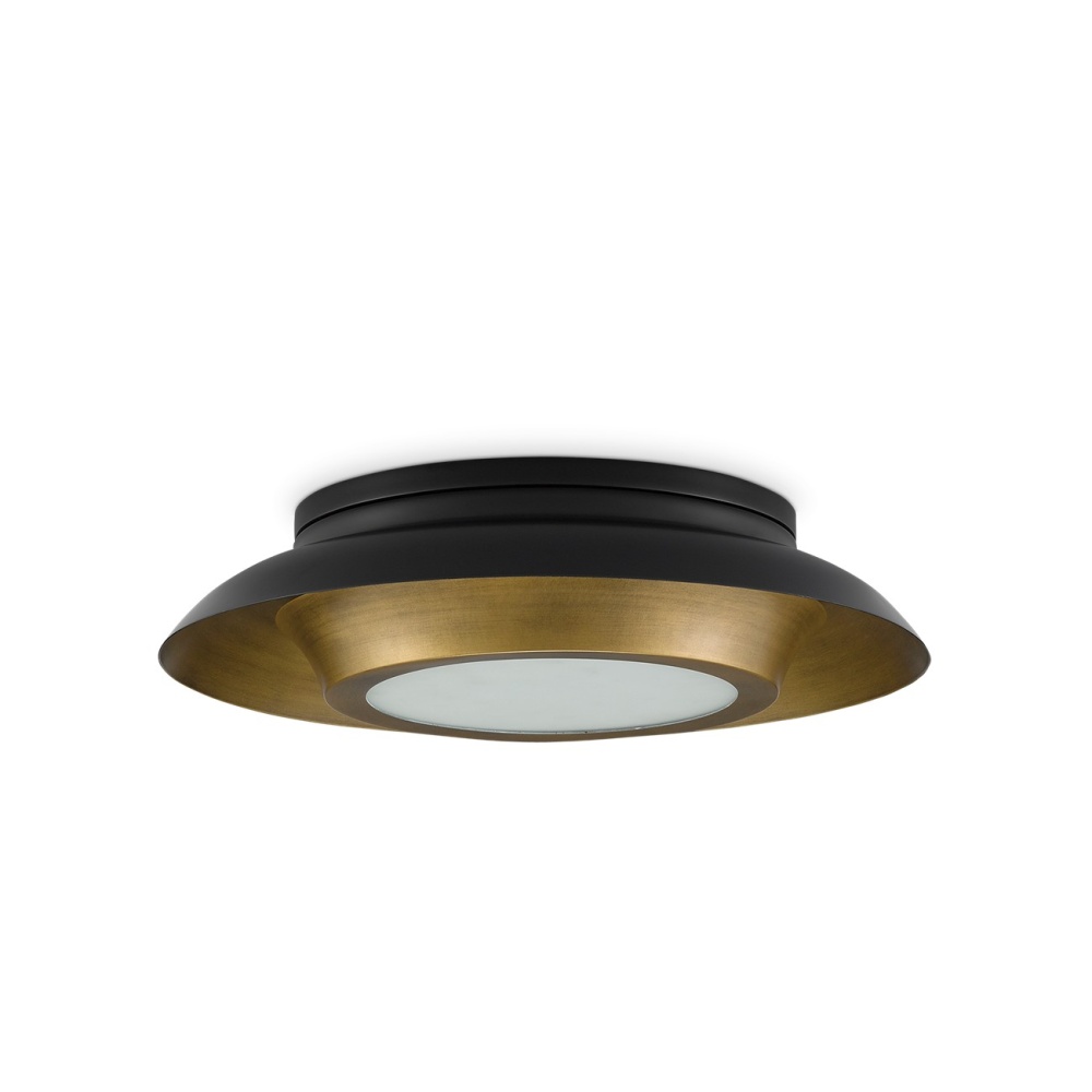 The Metaphor Flush Mount is made of brass in a mix of painted antique brass and painted black finishes. This intermingling of tones brings the gold and black flush mount a mid-century modern vibe. A frosted glass diffuser covers the light source.