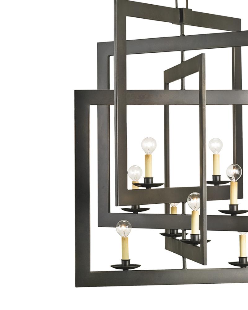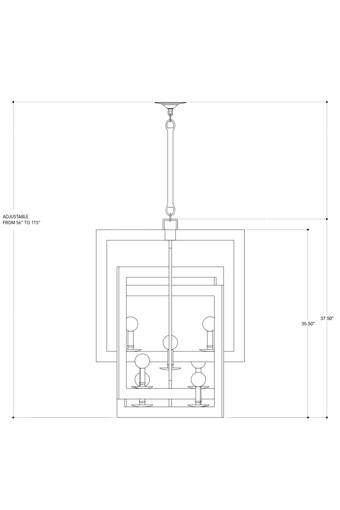 The Middleton Bronze Chandelier has interlocking squares created by wrought-iron bands that are smartly designed. The frame of this eight-light chandelier perfects the illusion of diminishing perspective, its bronze gold finish bringing it warmth. Adjustable from 56" to 115" with use of included chain/rod kit/cable. If your space calls for a longer drop, additional chain/rods/cable is available for purchase.