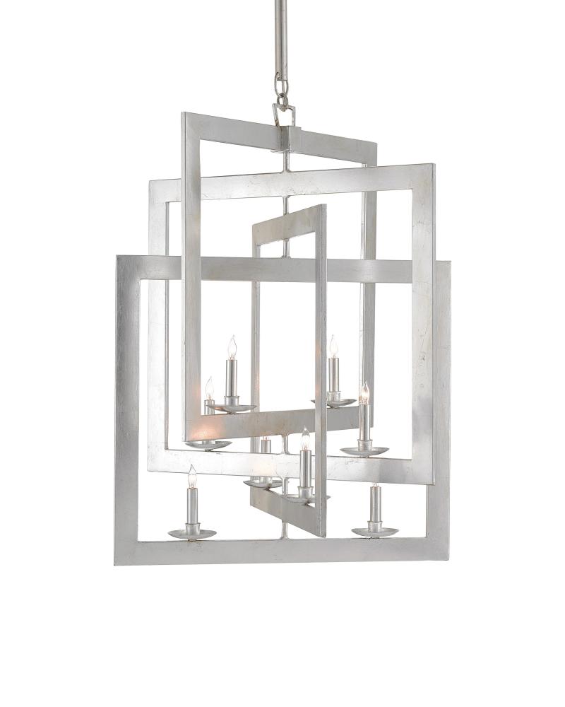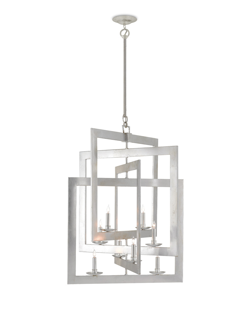 It was Aristotle who said the whole is more than the sum of its parts, which is oh so true with the silver version of our Middleton Chandelier. Were its interlocking squares created by wrought-iron bands fashioned any other way, it wouldn’t be the smartly designed light fixture that it is. The frame of this eight-light chandelier perfects the illusion of diminishing perspective, its contemporary silver leaf finish so fitting it’s a philosophical given. We also offer this fixture in a bronze gold finish and in a larger size.