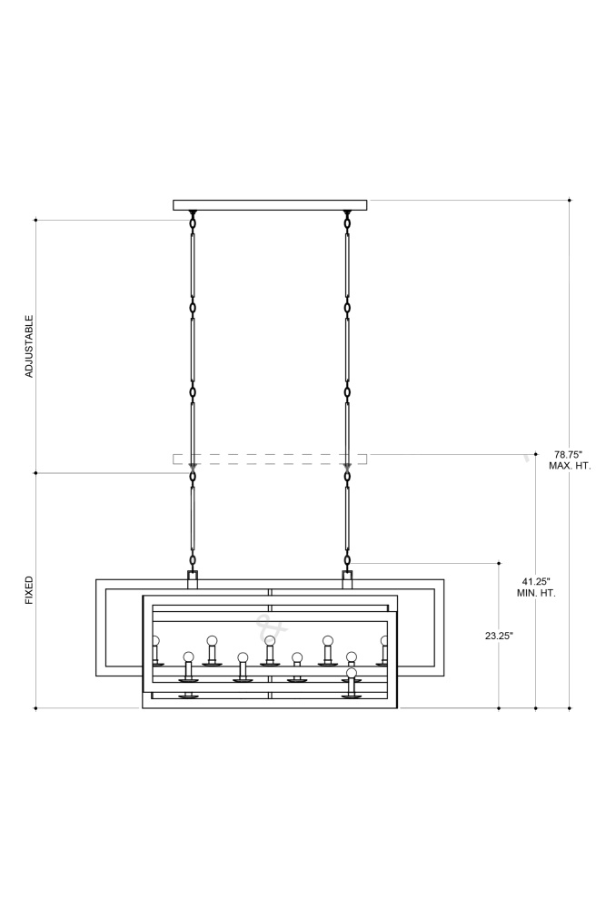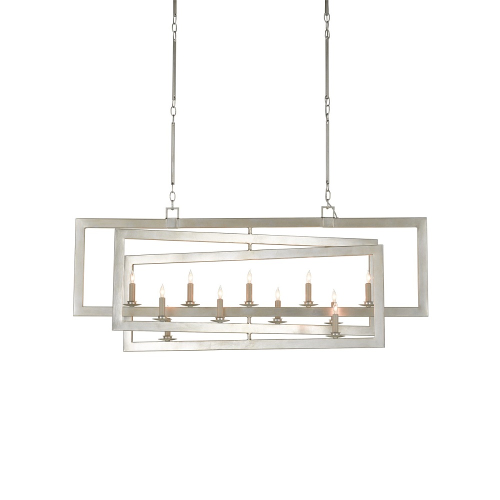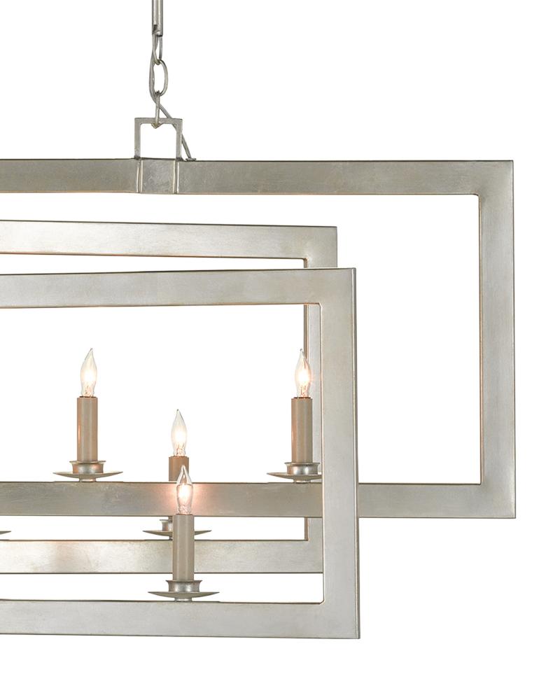 Our Middleton Rectangular Silver Chandelier has interlocking rectangles created by wrought-iron bands that are smartly designed. The frame of this chandelier perfects the illusion of diminishing perspective, its contemporary silver leaf finish making it gleam. Adjustable from 41.25" to 78.75" with use of included chain/rod kit/cable. If your space calls for a longer drop, additional chain/rods/cable is available for purchase.
