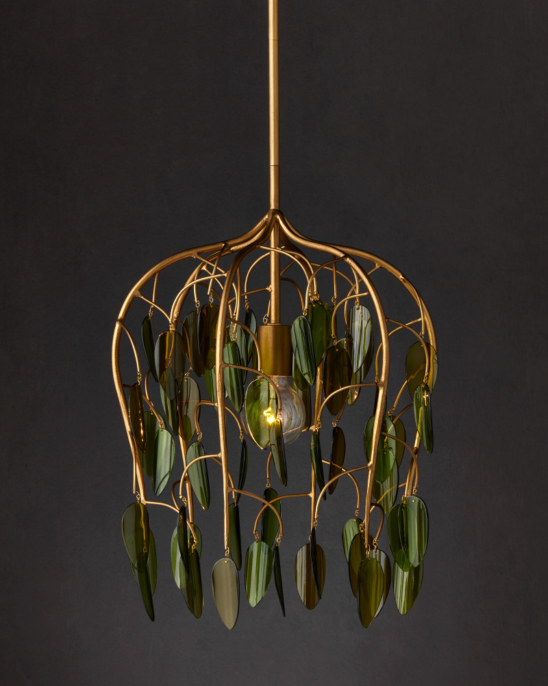 As lovely as a dangling blossom that calls to mind a balmy evening, the Midsummer Pendant blooms with artistry. A wrought iron frame that tapers from a clean-lined rod to thin tendrils as it graduates toward the bottom dangles curved petals made of recycled glass. The green and amber pieces retain the original colors of the beverage bottles from which they were taken. Because this fixture is artisanal, the configuration of the glass colors will vary slightly, which makes each green and gold pendant unique. Adjustable from 25" to 67" with use of included chain/rod kit/cable. If your space calls for a longer drop, additional chain/rods/cable is available for purchase.