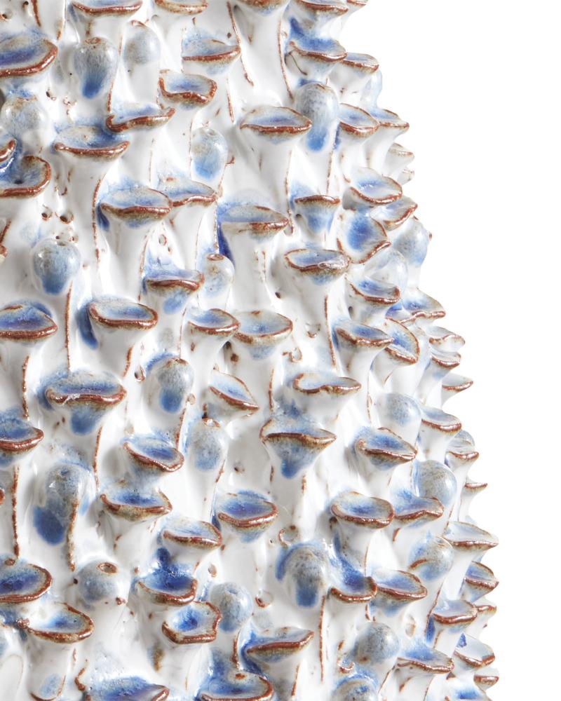 Our Milione Small Blue Vase is made by a group of women who live at the border of Burma and Thailand. The black ceramic vase has a white glazing and tiny blue leaves, each applied by hand to the side of the vase. This white vase is truly an artisanal piece, as each leaf is hand-glazed with a very subtle blue glazing.